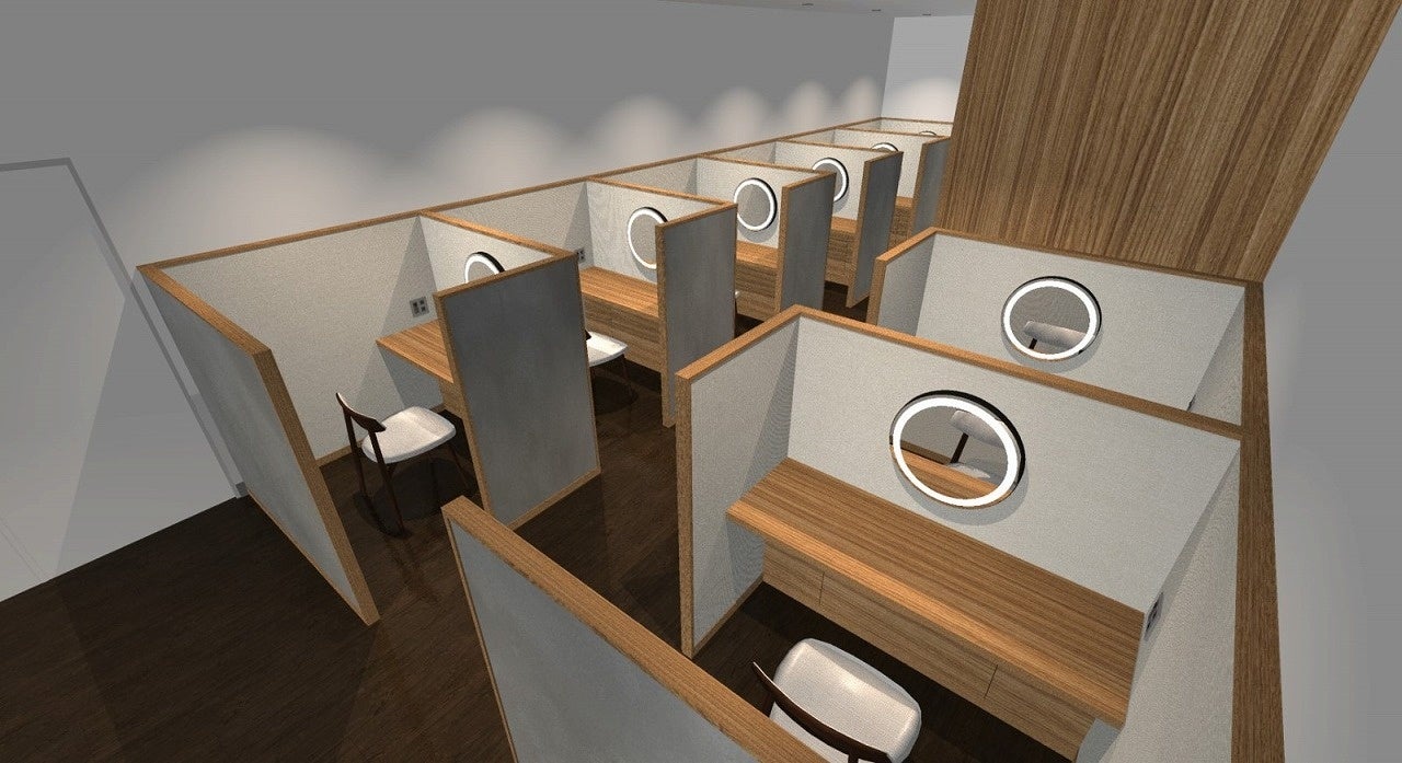 集中してオンライン会議などもできる個室17席・会議室2室を完備しています。個室にはLEDライトが付いた“女優ミラー”も設置し、ライブ配信などにもご利用いただけます。