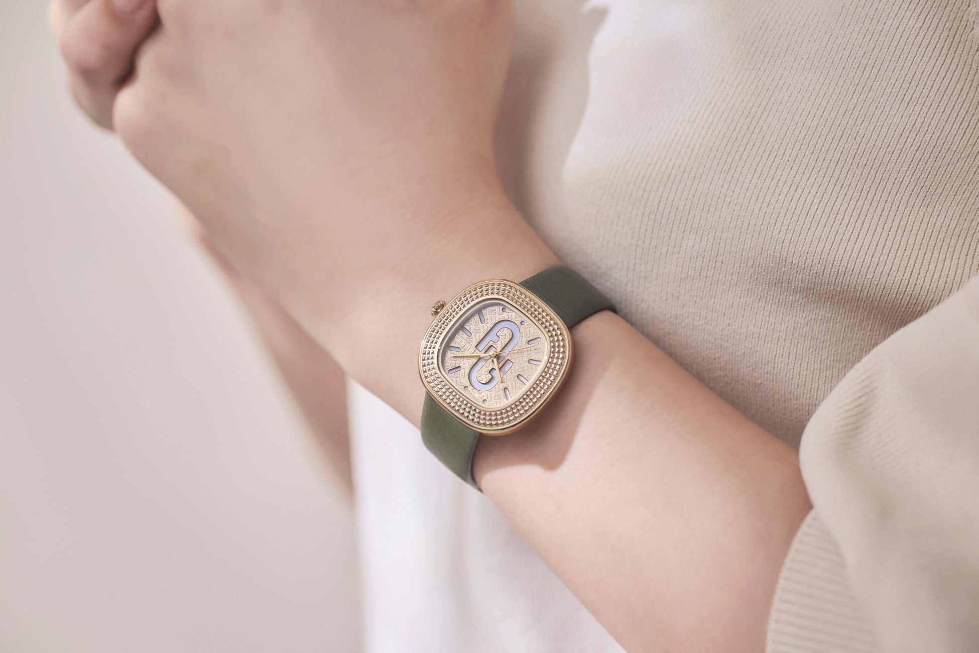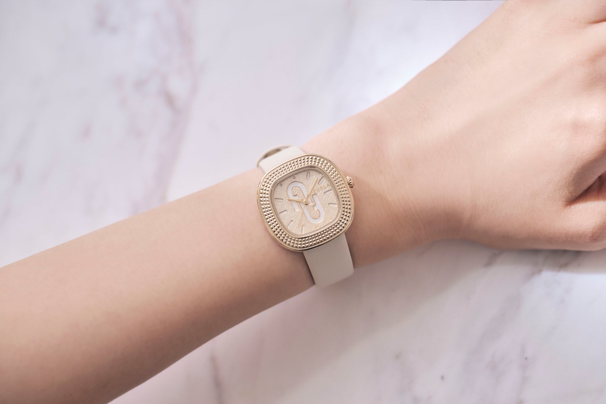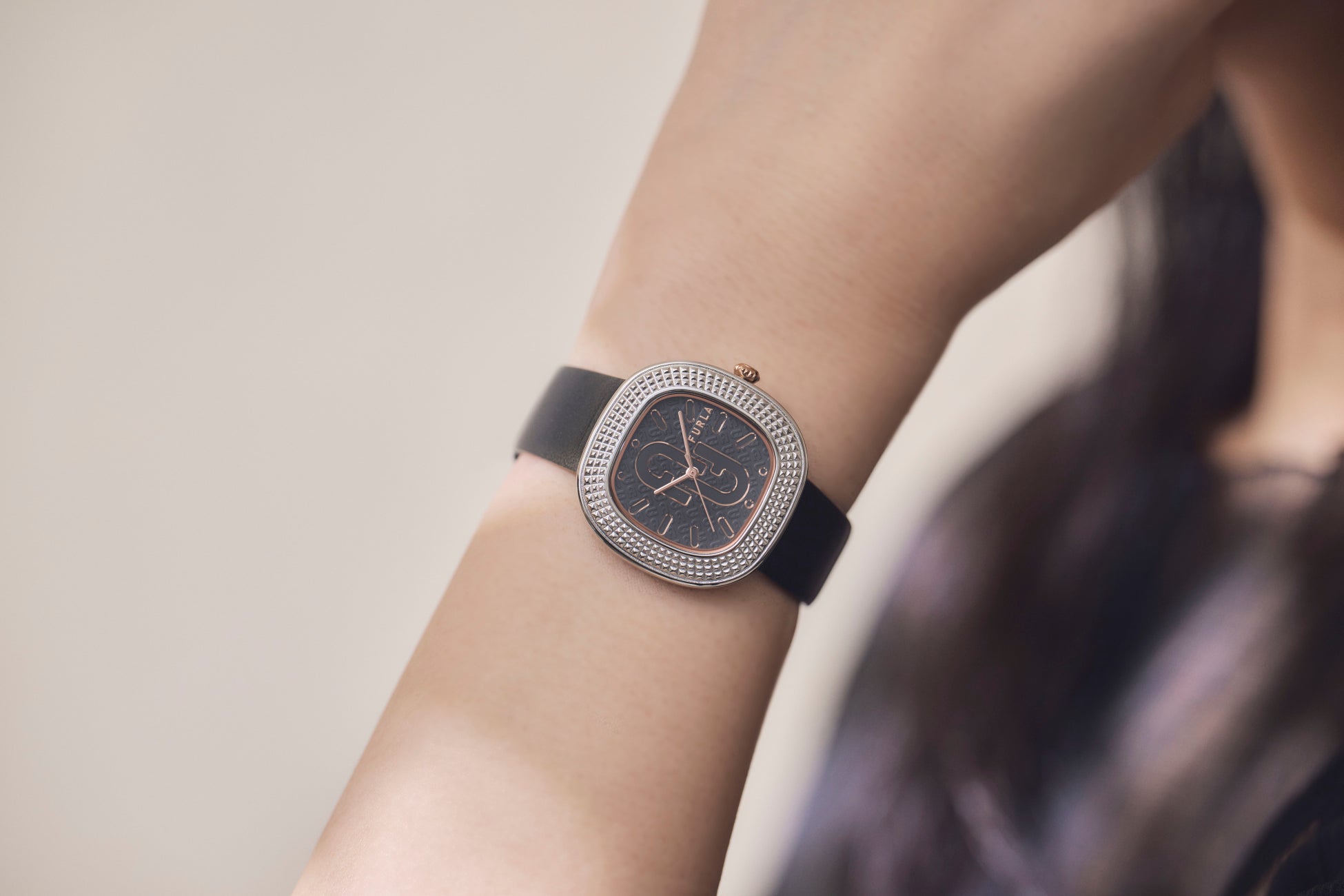 FURLAのアイデンティティであるブロックロゴとアイコニックなアーチロゴの両方をリューズやベルトなど随所に配置し、華やかな存在感を放ちます。