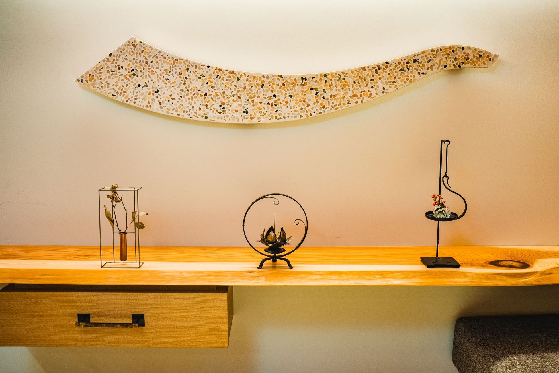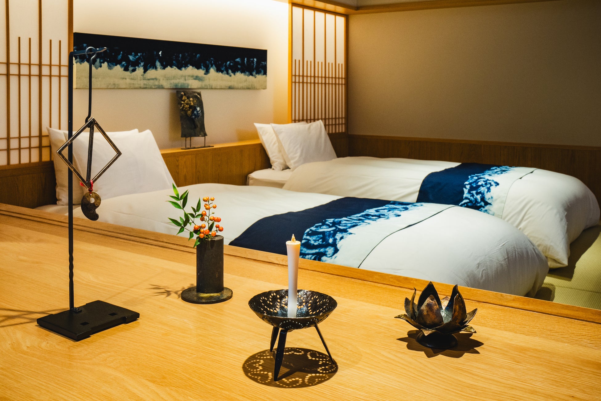 お部屋には、鍛治工房弘光で鍛造された鉄製品を並べたギャラリースペースを設けます。たたら製鉄が産み出した鉄の工芸品の数々。現代の暮らしに息づく“しつらえの道具”を、実際に見て、触れて、感じてもらいます。また、ベッドランナー・ベッドボードには、たたら製鉄によって作られる日本刀の刃紋をイメージした藍染を用意。 1870年創業の藍染紺屋、現在五代目の天野尚氏が作成しました。