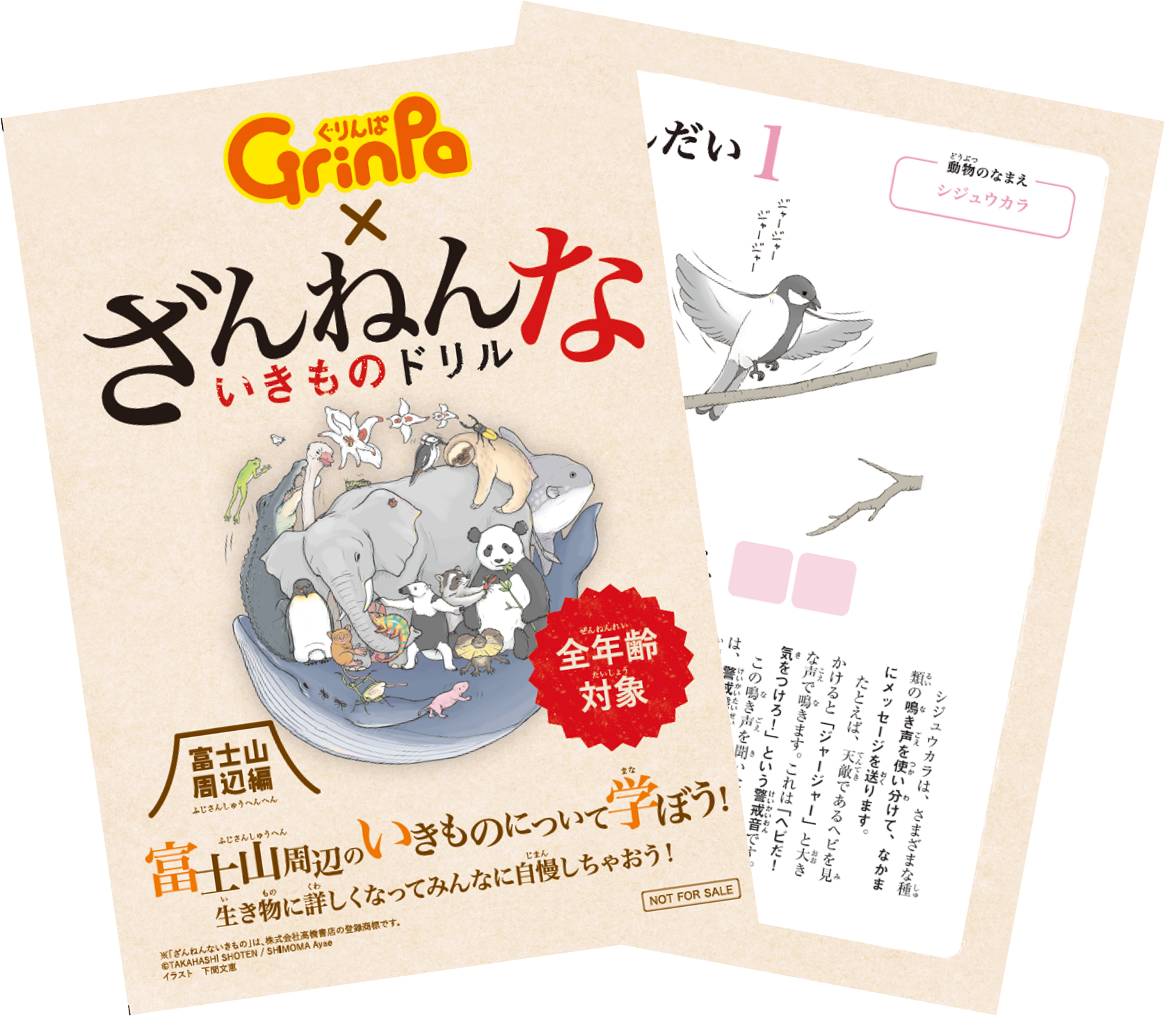 『ざんねんないきもの事典』より、遊園地「ぐりんぱ」周辺に生息するいきもの関連のクイズを集めた、オリジナルのクイズドリルを手に、園内に設置された問題を解くクイズラリーイベントです。全ての問題を解くと、ぐりんぱ×『ざんねんないきもの事典』のオリジナルステッカーをプレゼントいたします。