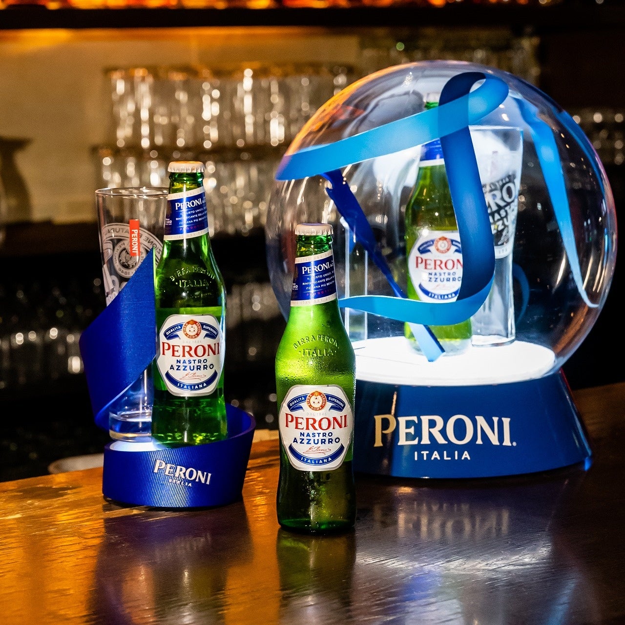 ①ペローニ ナストロアズーロ、またはペローニカクテルをご注文。