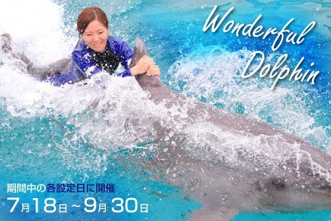 「ワンダフルドルフィン」は、パフォーマンスが実施されるステージの上で、ハンドサインを使用したイルカとのコミュニケーションを体験し、背ビレにつかまって一緒に遊泳することで、イルカの力強さを体感することができる特別なプログラムです。SNSでも好評だった職業体験プログラム「ジュニアトレーナー」の一部を大人にも体験いただき、イルカたちへの興味を深めていただくことを目的に実施しています。