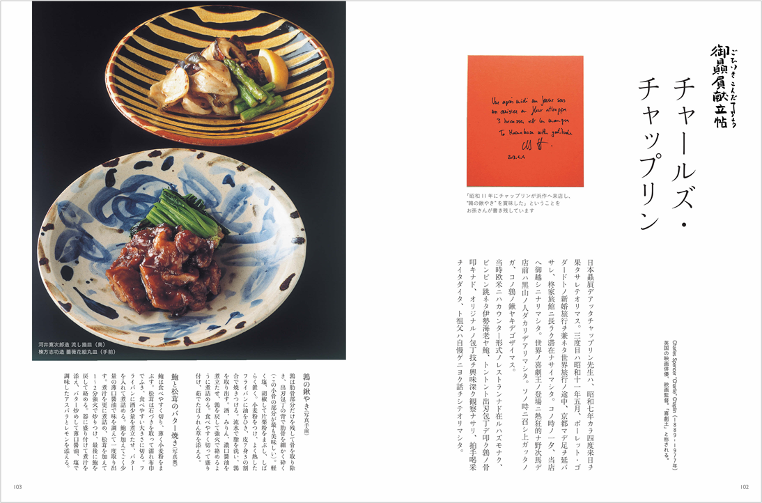 「浜作」には、各界でその道を極めた方々が「御贔屓さん」として来店。日本初のノーベル文学賞作家 川端康成をはじめ、美食家で有名な作家 向田邦子、喜劇王チャップリンや映画監督の小津安二郎、 そして、歌舞伎界の人間国宝 中村吉右衛門など。 本書の【御贔屓献立帖】では、「御贔屓さん」が愛した逸品をご紹介します。