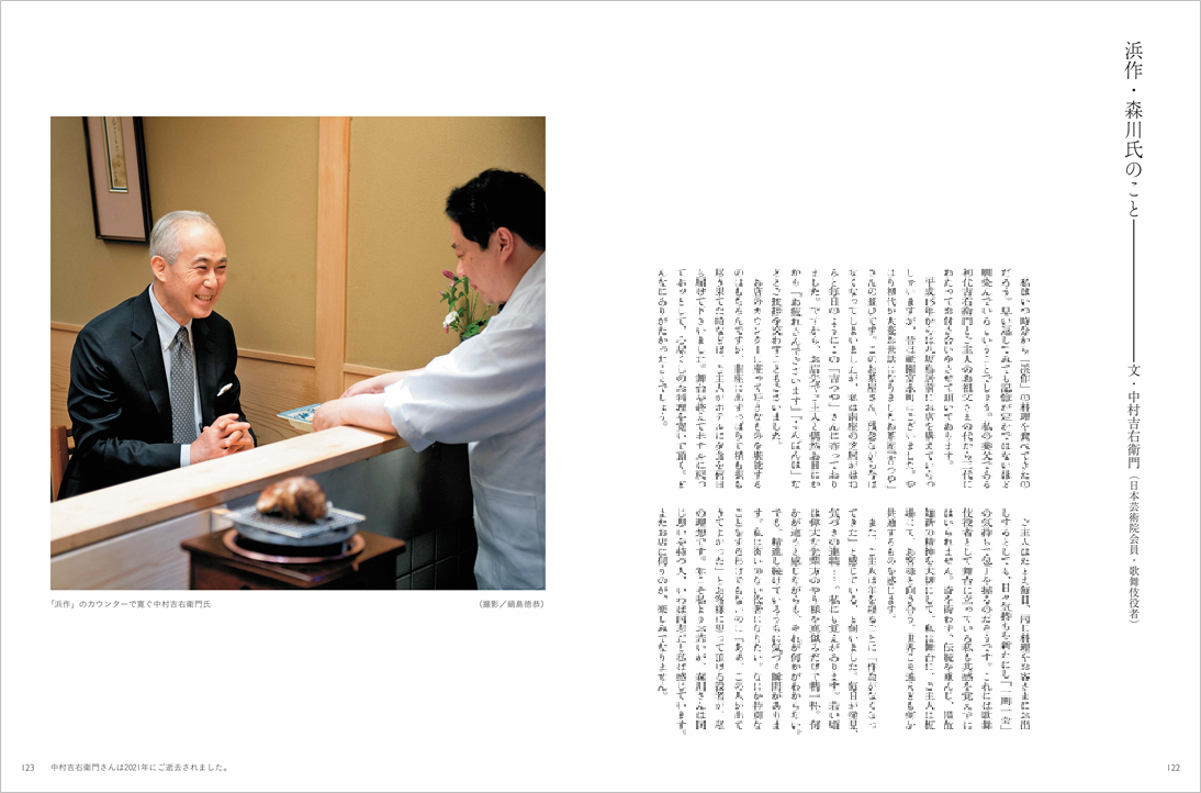 中村吉右衛門さんの養父、初代吉右衛門さんの代よりお付き合いのある「浜作」との想いを綴った、貴重な寄稿文も掲載。生前の深い親交が偲ばれるページになっています。