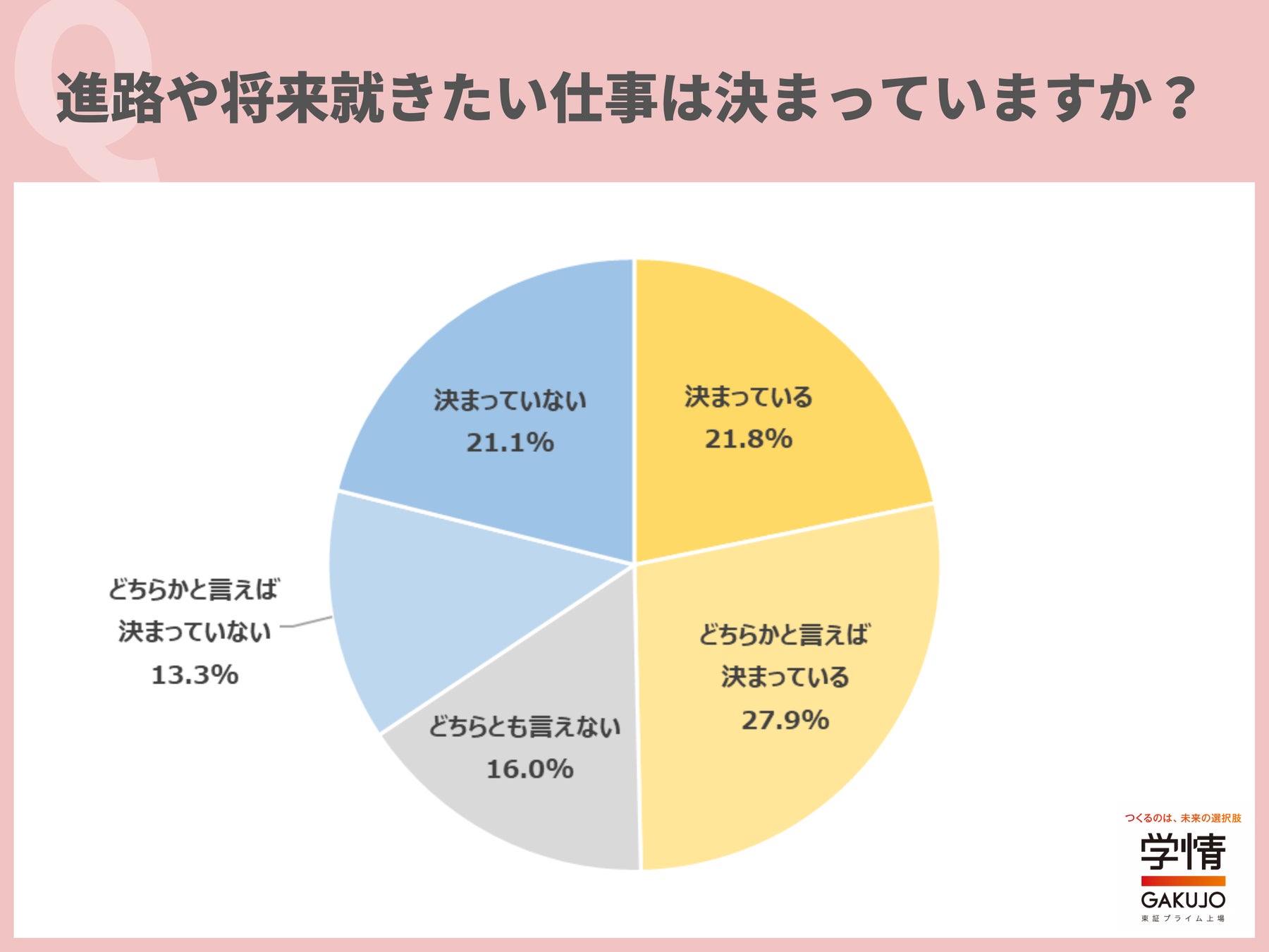 希望する進路や、将来就きたい仕事が「決まっている」と回答した学生は21.8%でした。「どちらかと言えば決まっている」27.9%を合わせると、約半数の学生が「希望する進路や、将来就きたい仕事が決まっている」としています。「大学進学前から希望していた進路がある」「大学で学んだことを活かせる仕事に就きたい」といった声の他、「まだ自分の視野が狭いと感じるので、これから色々な業種や職種を学んでいきたい」「インターンシップへの参加を通して、実際に就職したい企業を決めていきたい」といった声が上がっています。