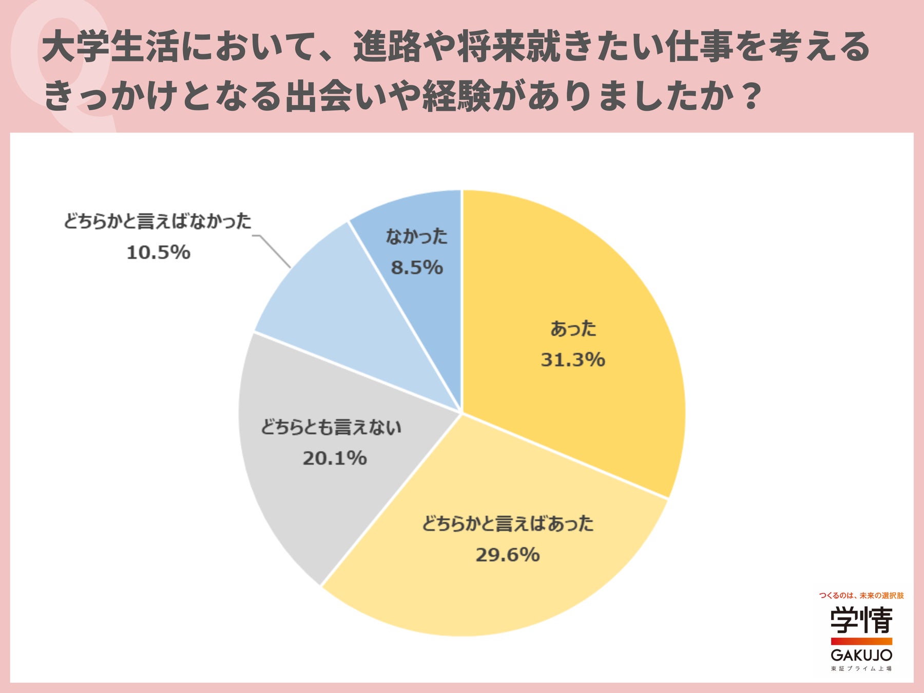 大学生活において、「進路や将来就きたい仕事を考えるきっかけとなる、出会いや経験があった」と回答した学生が31.3%に上りました。「どちらかと言えばあった」29.6%を合わせると、6割以上の学生が、学生生活の中で、進路を考えるきっかけとなる出会いや経験を得ていることが分かります。「研究熱心な大学の友人にいつも刺激を受けている」「アルバイトを通して社会を経験することで、価値観が大きく変わったと思う」「所属している部活動のOBの方から仕事の話を聞いたことが、就職について深く考えるきっかけになった」「インターンシップに参加して、将来について具体的に考えるようになった」といった声が寄せられました。