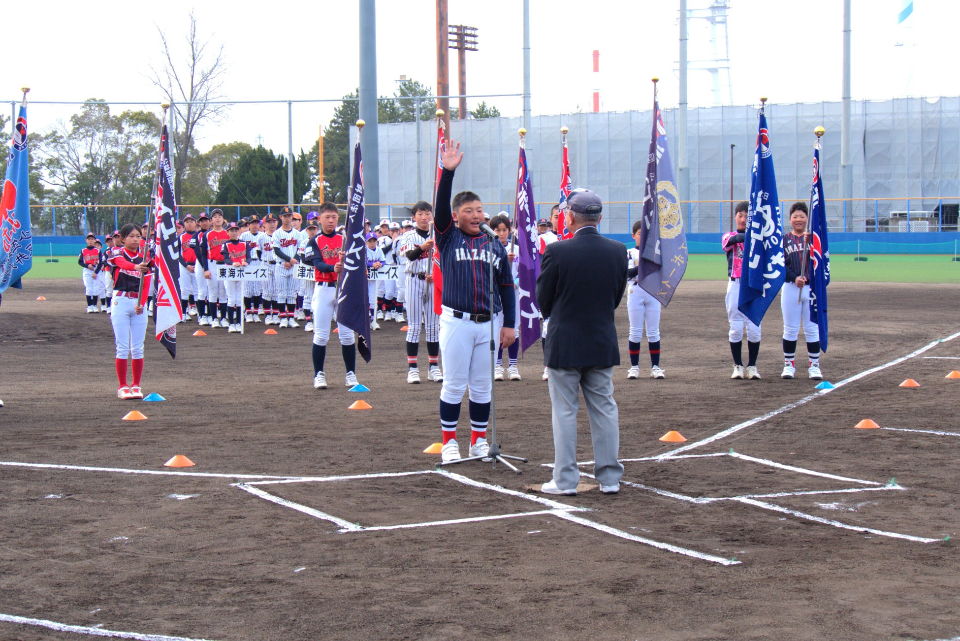 公益財団法人日本少年野球連盟ボーイズリーグ主催の少年硬式野球大会が、2月16日(日)に三重県四日市市霞ケ浦第3野球場で開幕しました。始球式にはメ~テレ(名古屋テレビ放送)のマスコットキャラクター・ウルフィが登場しました。