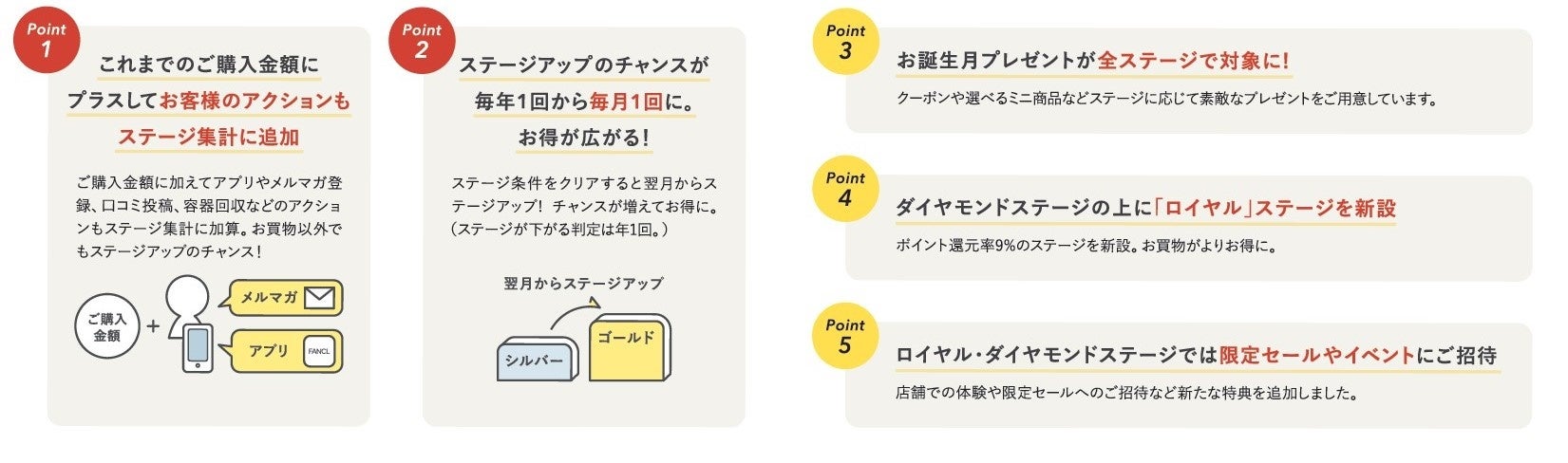 従来の購入金額に応じた割引ポイントを付与する「経済的価値を提供するサービス」から、お客様とのアクションやつながりを活性化し、お客様体験価値を高める「LTV※向上を目指すファンケルならではのサービス」へと進化させてまいります。