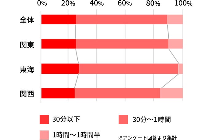 前年同様に全地域で「30分〜1時間」が最多となった。