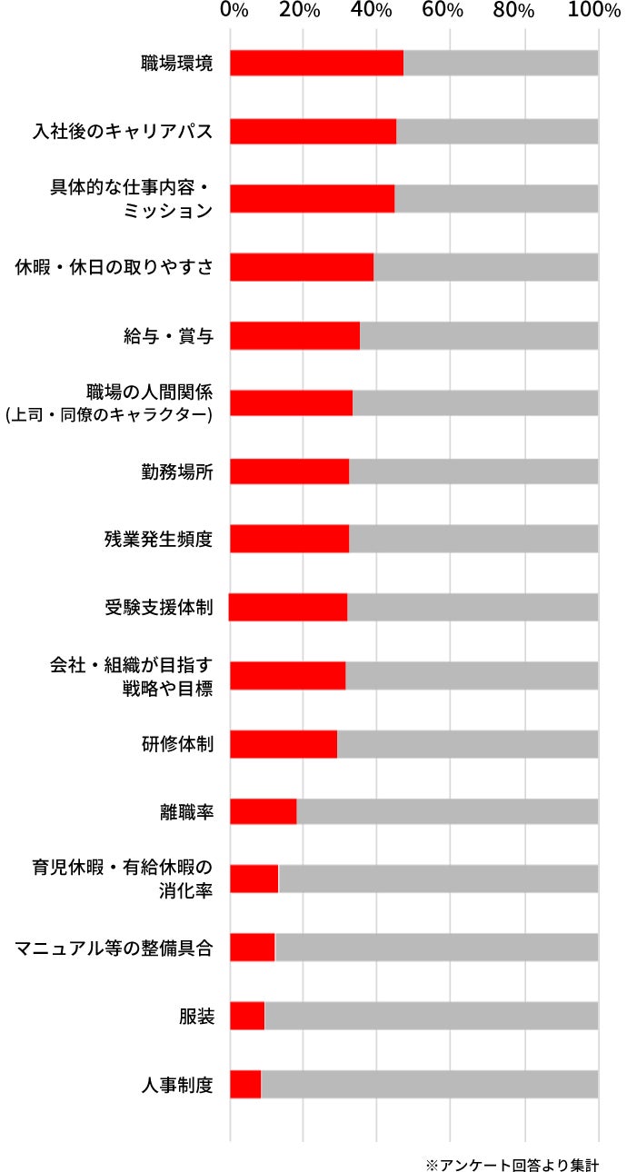 前年と比べ「職場環境」の回答が大幅に増加し(30%→40%)最多となった。他にも、「入社後のキャリアパス」「具体的な仕事内容・ミッション」の回答も多いことから、働く環境や将来のキャリアプランが具体的に想像できる情報が求められている。