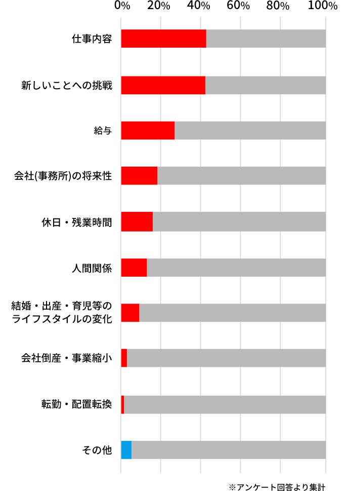 「仕事内容」「新しいことへの挑戦」がほぼ同数で多い結果となった。