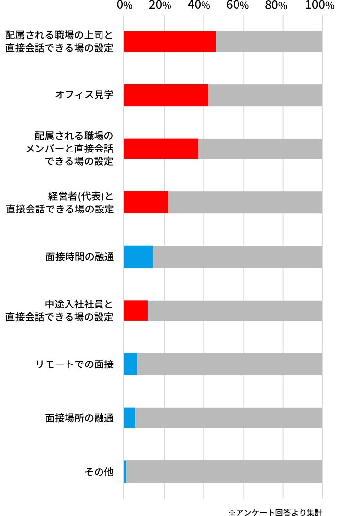 前年同様に「配属される職場の上司と直接会話できる場の設定」「オフィス見学」「配属される職場のメンバーと直接会話できる場の設定」など、職場環境が分かる機会の設定が上位となった。