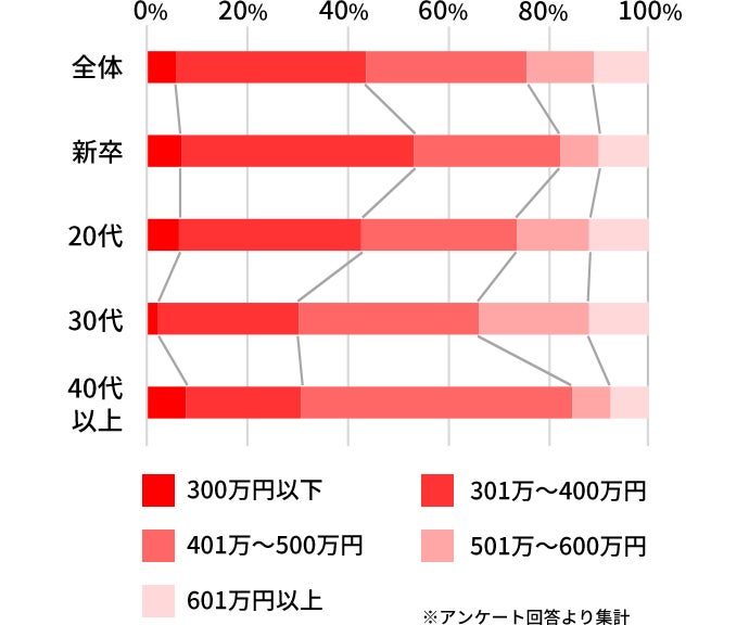 全体では「301万~400万円」が最多で、前年同様に現年収を踏まえた堅実な希望年収となった。