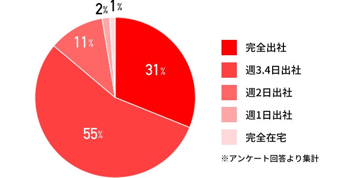 前年の結果と比べ「完全出社」の割合が増えており(28%→31%)、出社を希望する傾向が強まっている。しかし、「週3,4日出社」も半数以上を占めており、求職者からは柔軟な勤務形態が求められていることが分かる。