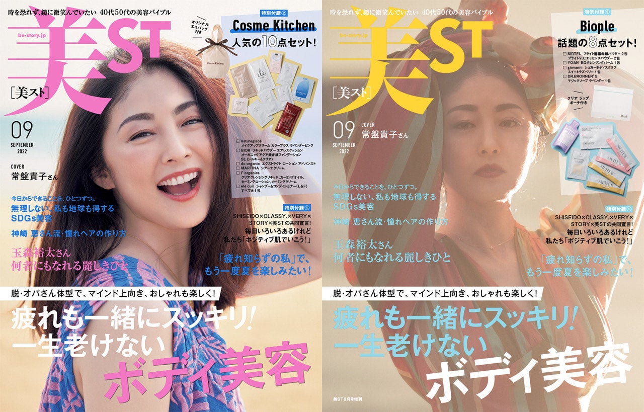 『美ST』9月号表紙は女優の常盤貴子さん!本誌はCosmeKitchen10点セット、増刊はBiople8点セットの超豪華付録