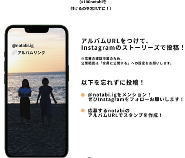 notabi公式Instagramアカウントをメンション(@notabi.ig)し、notabiで投稿したアルバムのURLを付けて Instagram のストーリーズに投稿すること