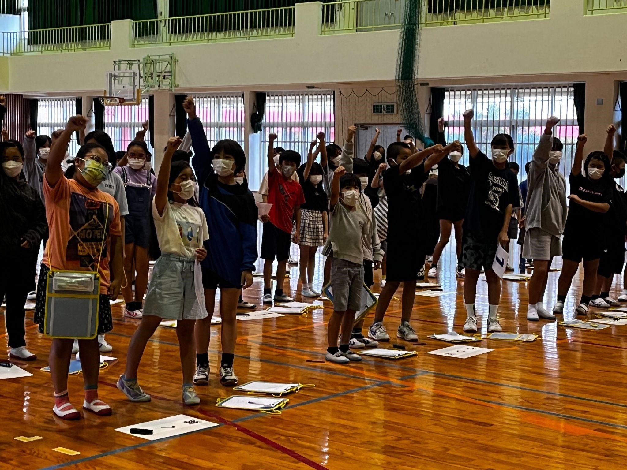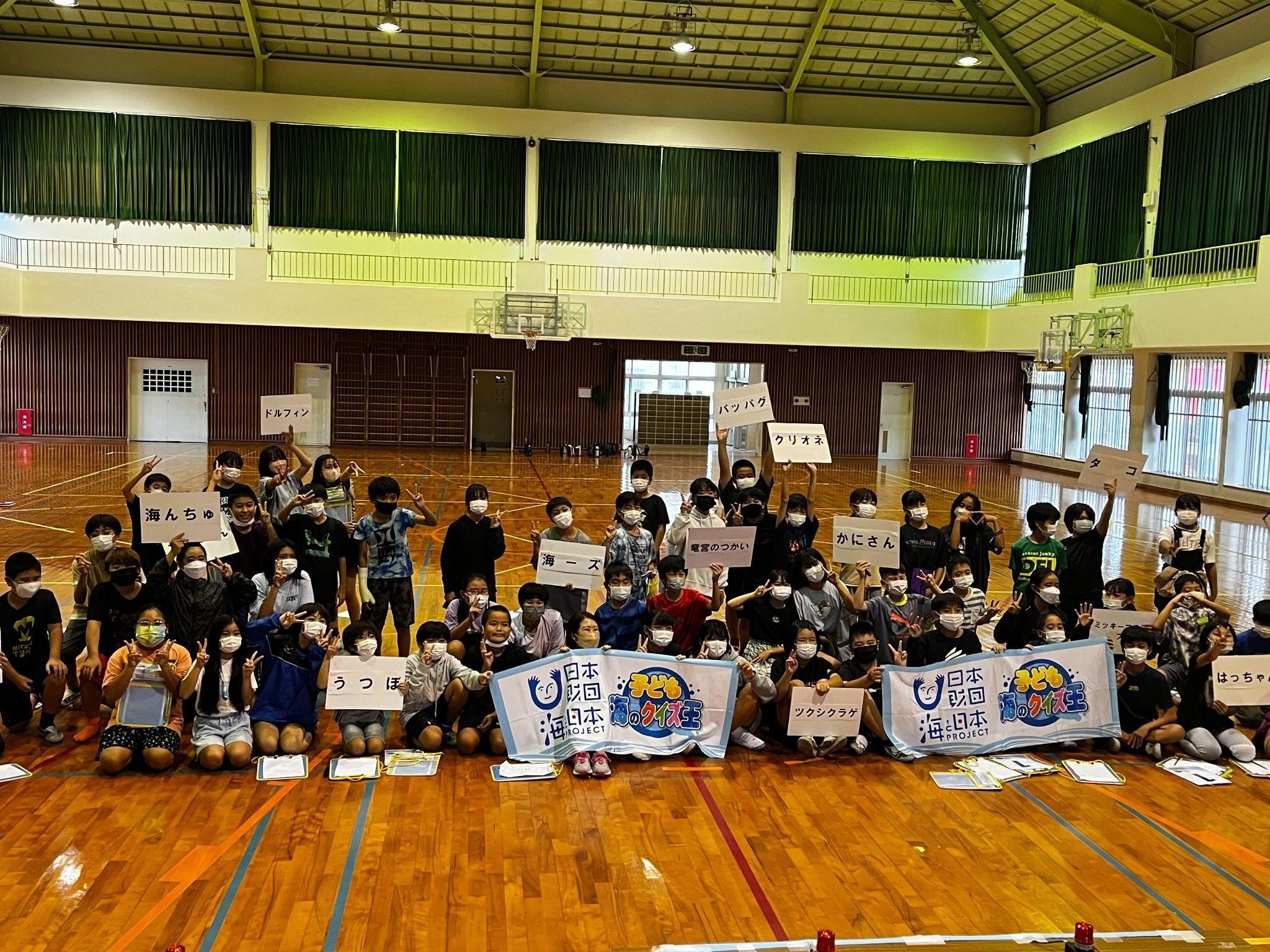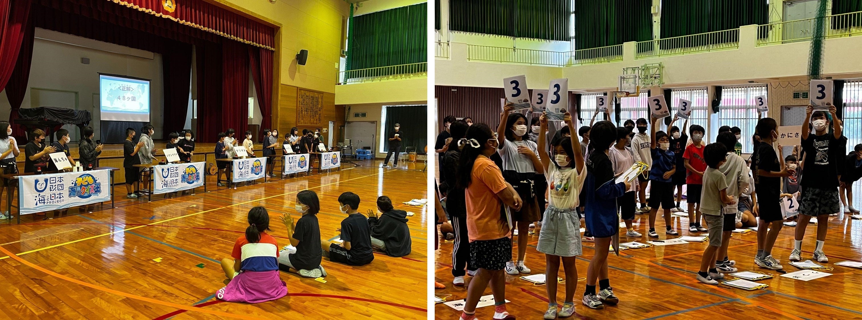海を身近に感じられる問題が次々と繰り出されました。児童のみなさんが集中してクイズを聞いて、「わかったぞ!」という瞬間の真摯な表情でボタンを押し、正解したときの喜びや、誤答だったときのくやしさが、体育館の熱気になって伝わります。