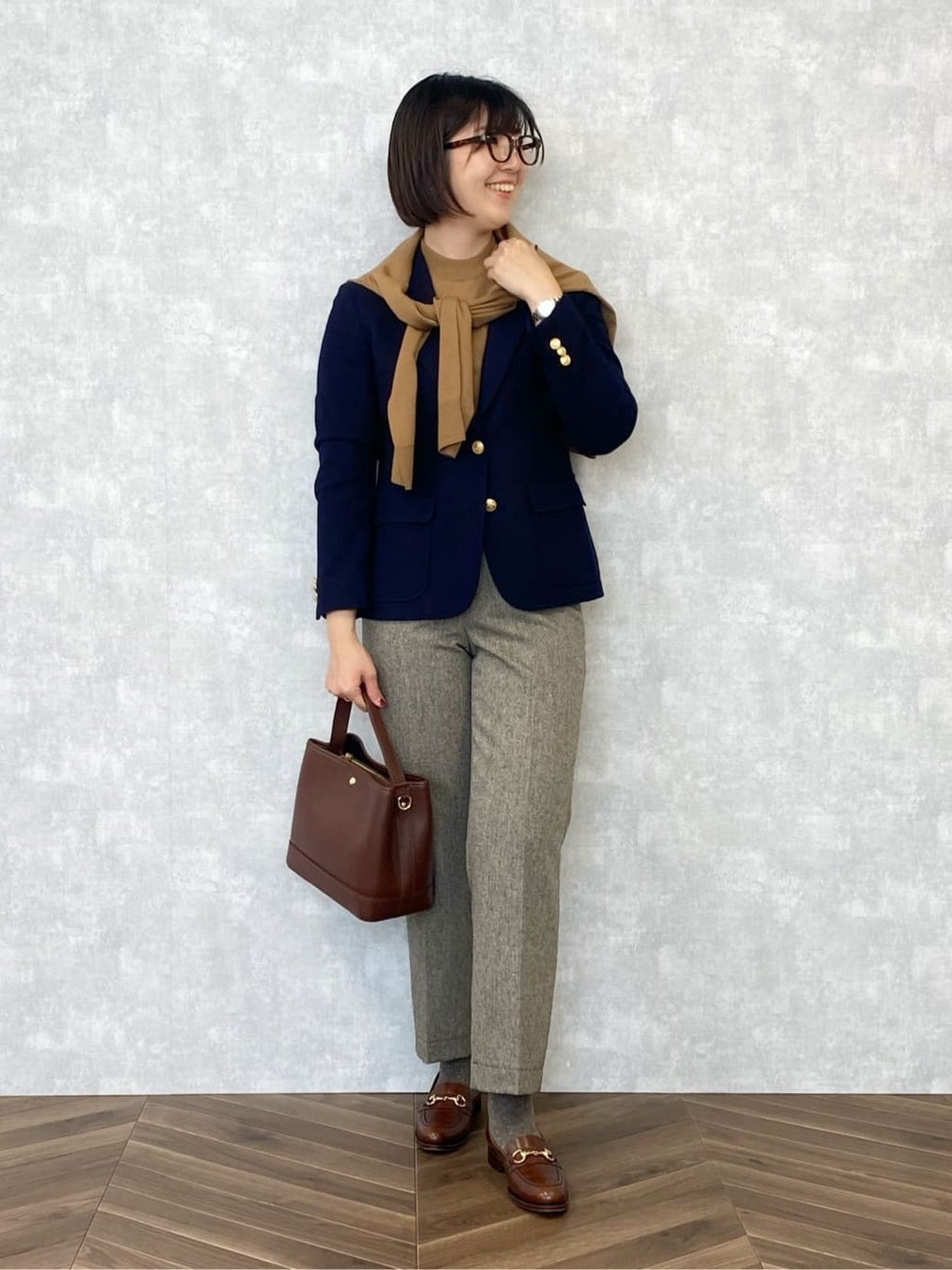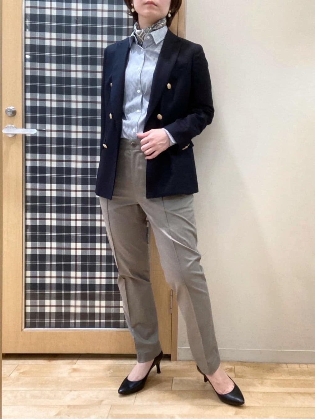 <ハンサムトラッドコーデ>11日はブレザーデー! ダブルブレストブレザーを正統派トラッドアイテムでスタイリングしました。 気温が下がってきたら、シャツの襟元にスカーフを巻くとアクセントと防寒になりますね◎