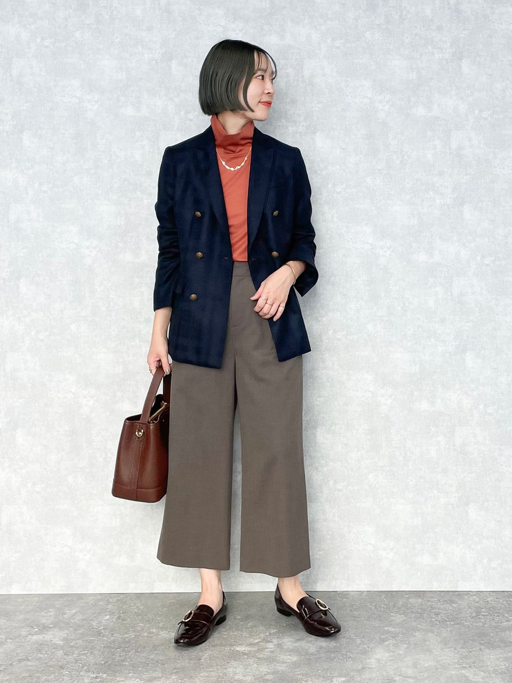 NEWYORKER MELTON(ニューヨーカー メルトン)のブレザーを着用したオンオフ兼用コーデ。涼しくなると秋冬らしい素材感を纏いたくなりますね。 コート未満のアウター感覚で、デイリーに着用いただけます。