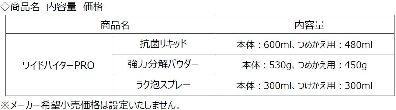 ※「ワイドハイターPRO 抗菌リキッド」「ワイドハイターPRO 強力分解パウダー」「ワイドハイターPRO ラク泡スプレー」は、商品特長や使う場面を、より分かりやすくお伝えできるように、これまでの「ワイドハイター CLEAR HERO 抗菌リキッド」「ワイドハイター CLEAR HERO クレンジングパウダー」「ワイドハイター CLEAR HERO ラク泡スプレー」のパッケージを新たにリニューアルしました。中身の変更はありません。