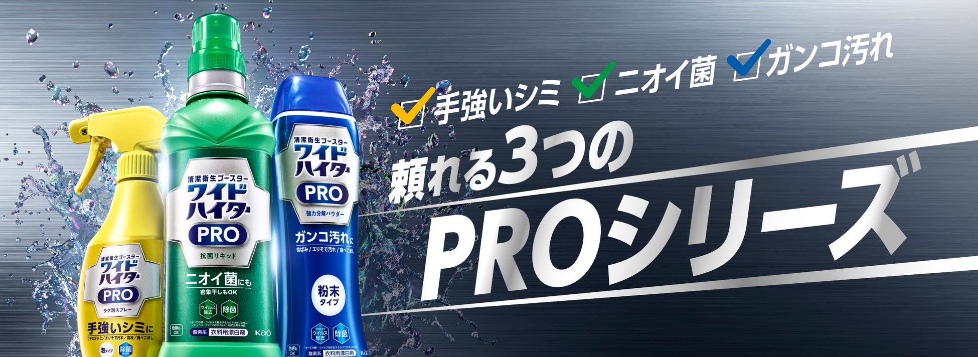 ワイドハイターPROシリーズでは、普段のお洗たくでは解決しきれない、深いお洗たく悩みに対応した「ワイドハイターPRO 抗菌リキッド」「ワイドハイターPRO 強力分解パウダー」「ワイドハイターPRO ラク泡スプレー」をラインアップしました※。
