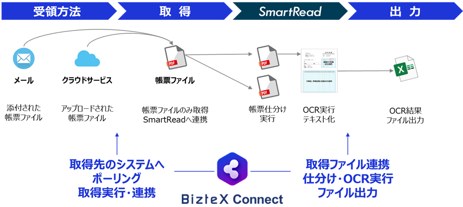 BizteXは、「BizteX Connect」に「SmartRead」と連携するモジュールをTISと共同開発しました。このモジュールにより、「SmartRead」への単純なアップロードやダウンロード機能だけでなく、SmartReadが持つ帳票の仕分けやOCR実行、処理ステータスをトリガーに自動でOCR結果をダウンロードするなどAI OCRをより自動化することが可能となります。