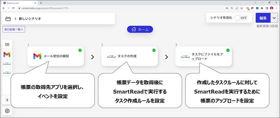 <本モジュールを活用したOCR実行の一例:BizteX Connectのシナリオ設定画面>