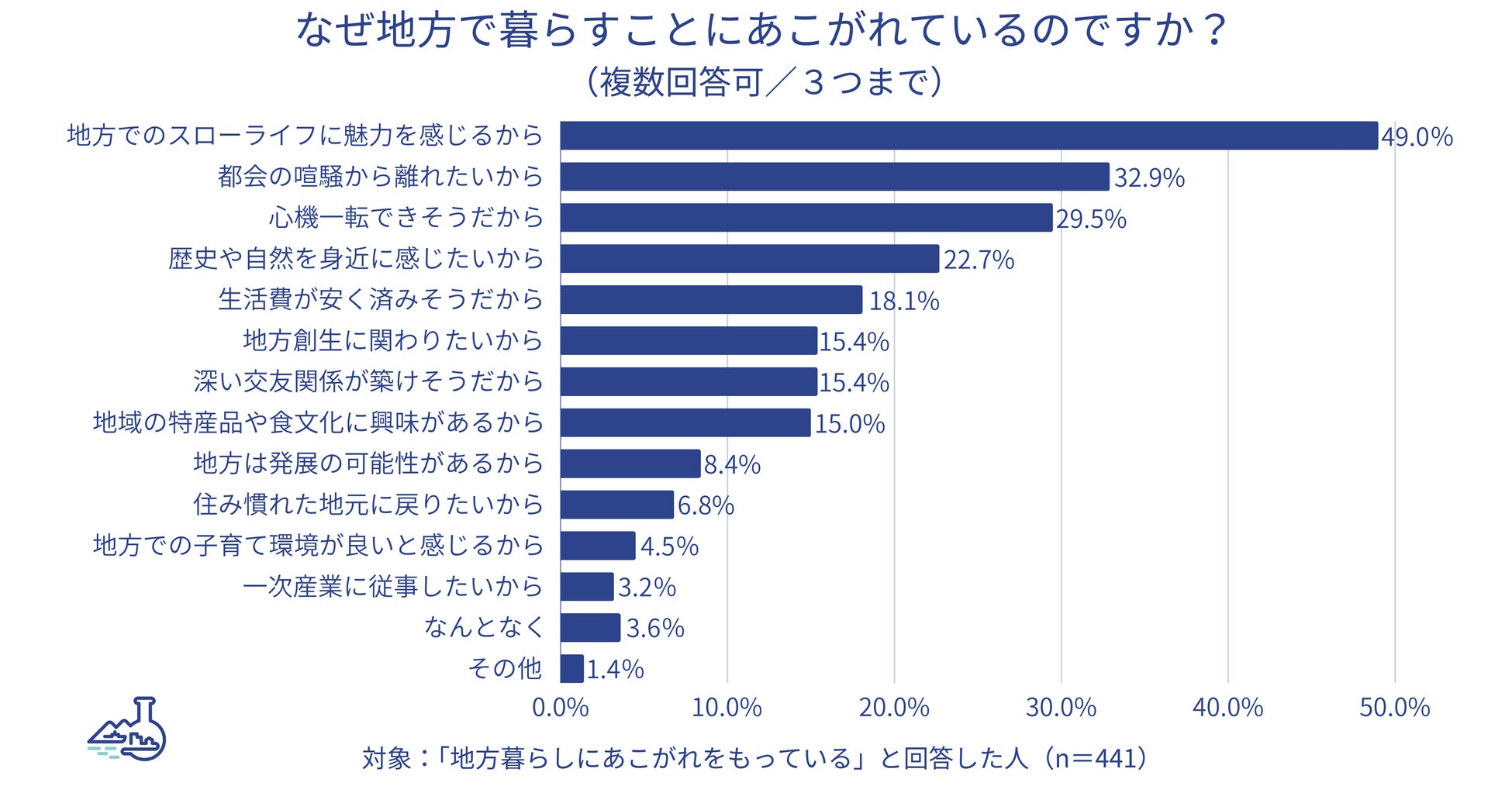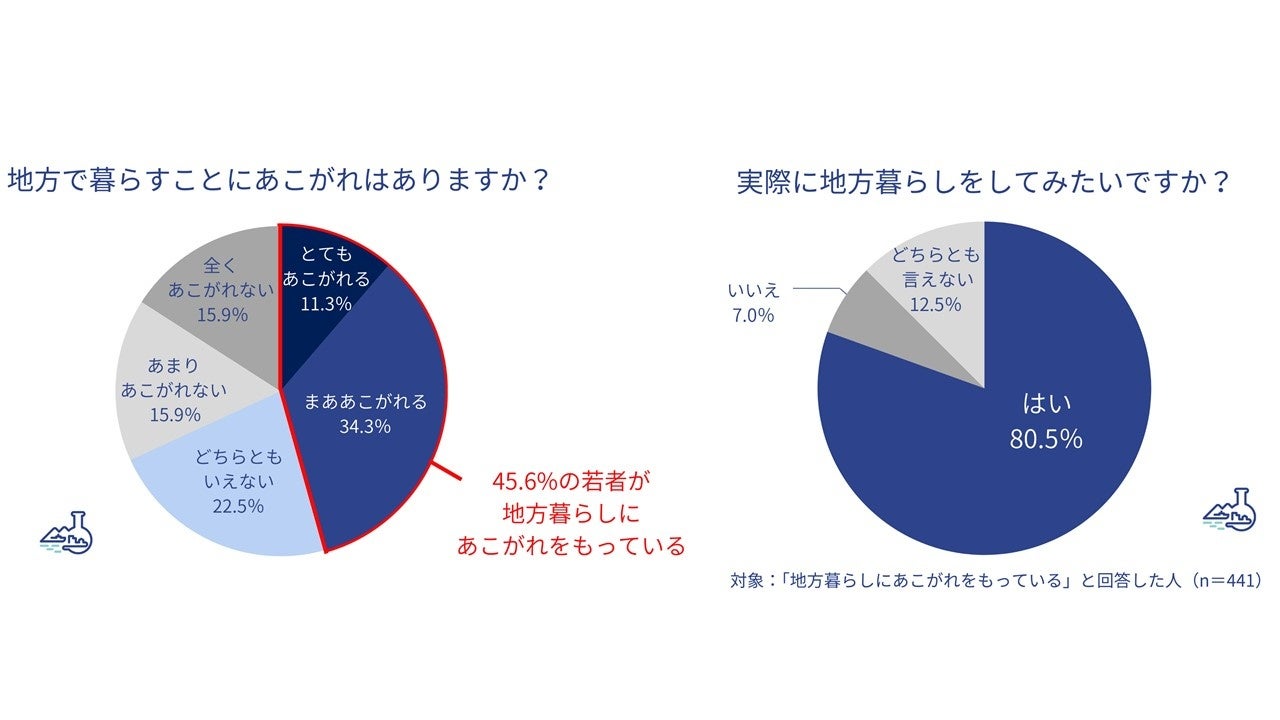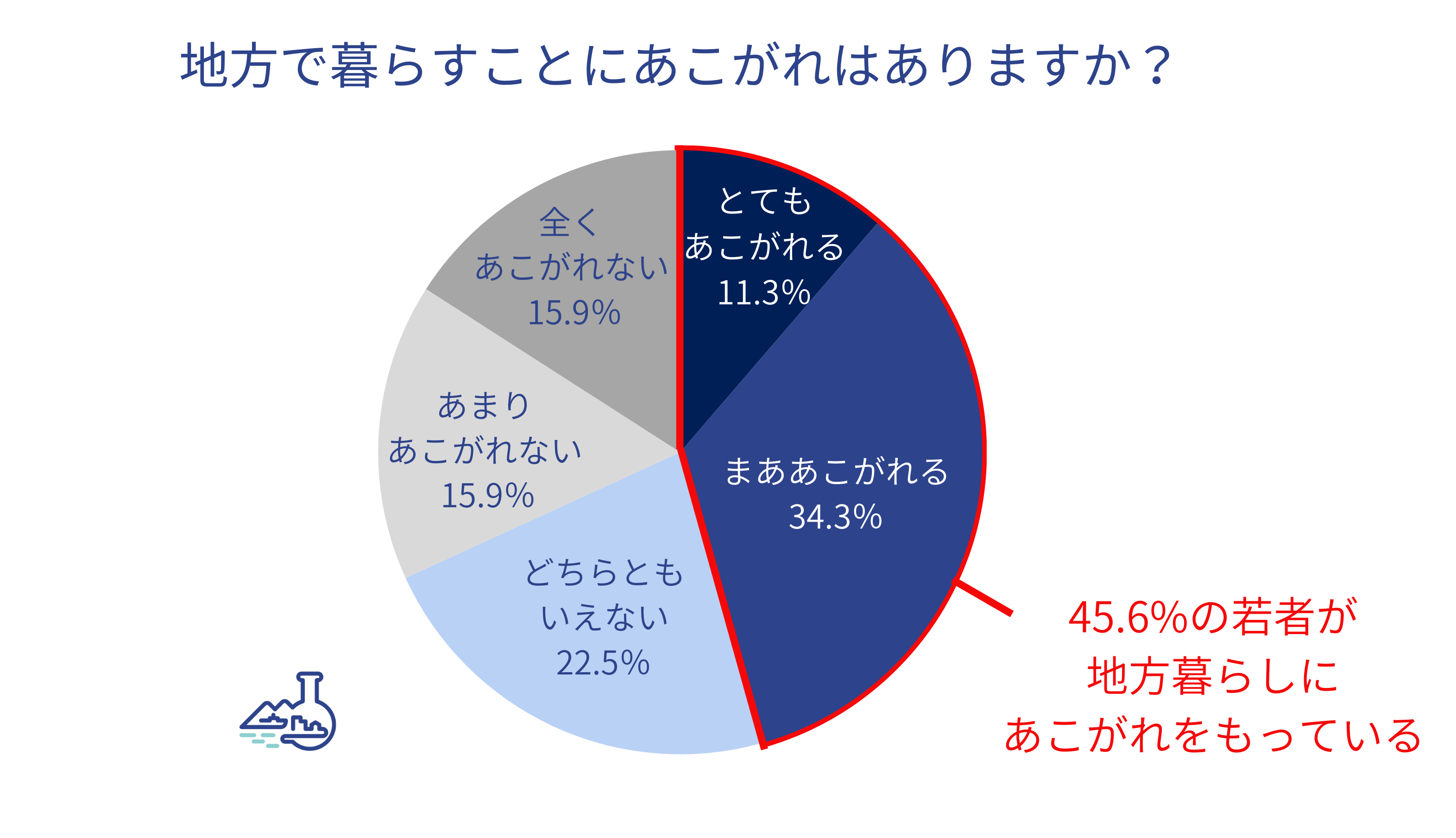 地方で暮らすことに憧れる若者は45.6%(「とても憧れる」「まあ憧れる」の計)。理由は多い順に「地方でのスローライフに魅力を感じるから」(49.0%)「都会の喧騒から離れたいから」(32.9%)「心機一転できそうだから」(29.5%)。都会疲れが地方への憧れを生んでいる実態が明らかに。一方、地方に憧れる人のうち、実際に暮らそうと思えない理由は「交通の便」(61.6%)「働き先の有無」(37.2%)「金銭面」(26.7%)と現実的な回答が目立った。