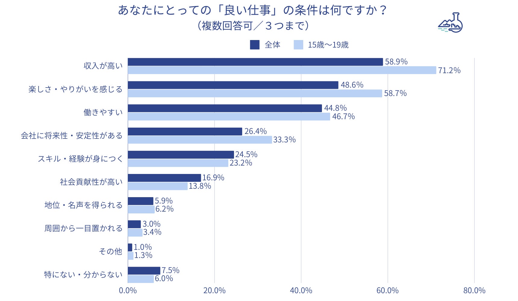 「良い仕事」の条件は、昨年と同様の順位で、「収入が高い」、「楽しさ・やりがいを感じる」、「働きやすい」がトップ3に。特に10代の7割以上が「収入が高い」を選択した。