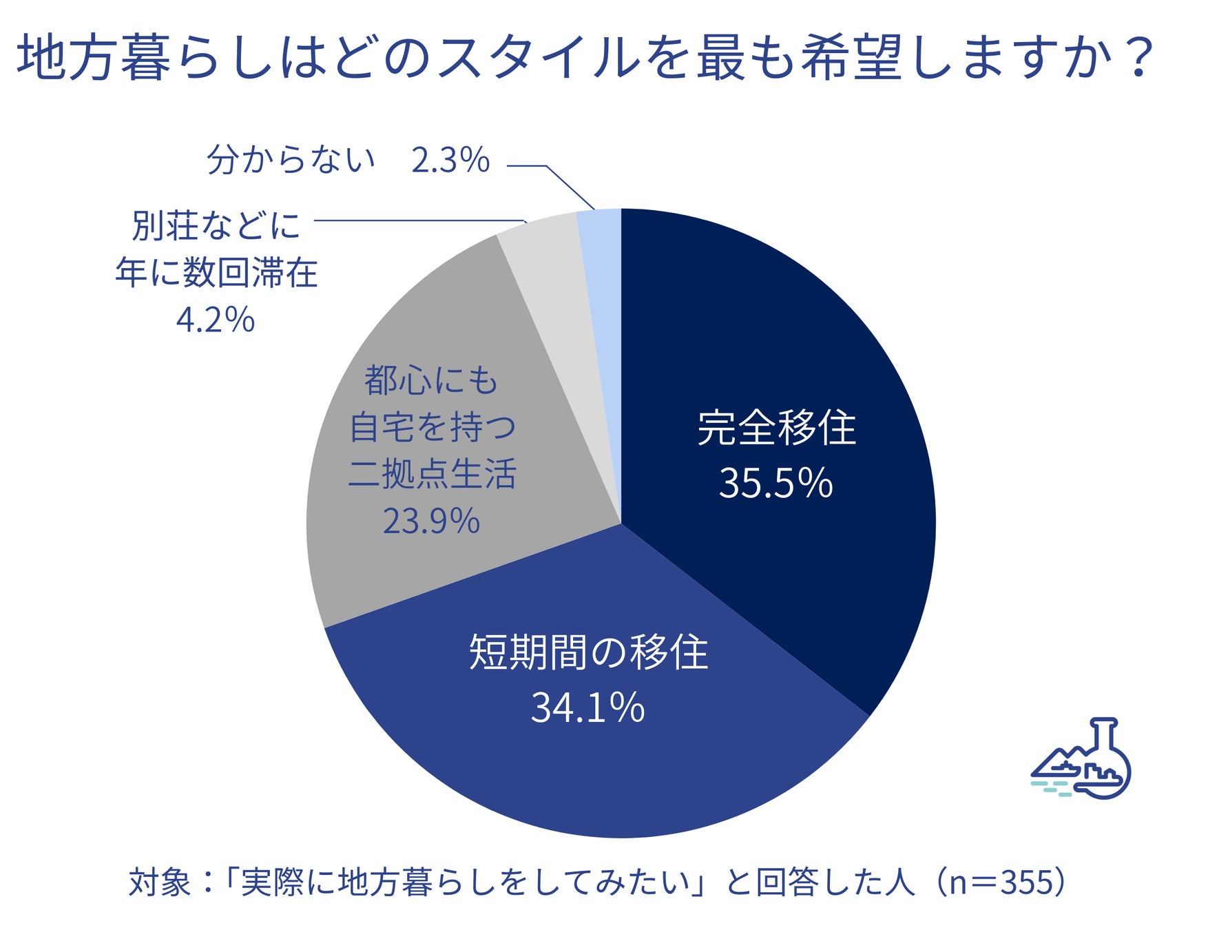 希望の地方暮らしのスタイルは「完全移住」(35.5%)が前回※同様最多だが、12ポイント減少。一方、次点の「お試しなどの短期間移住」が34.1%と、12ポイント増え、完全移住希望とほぼ並ぶ結果となった。