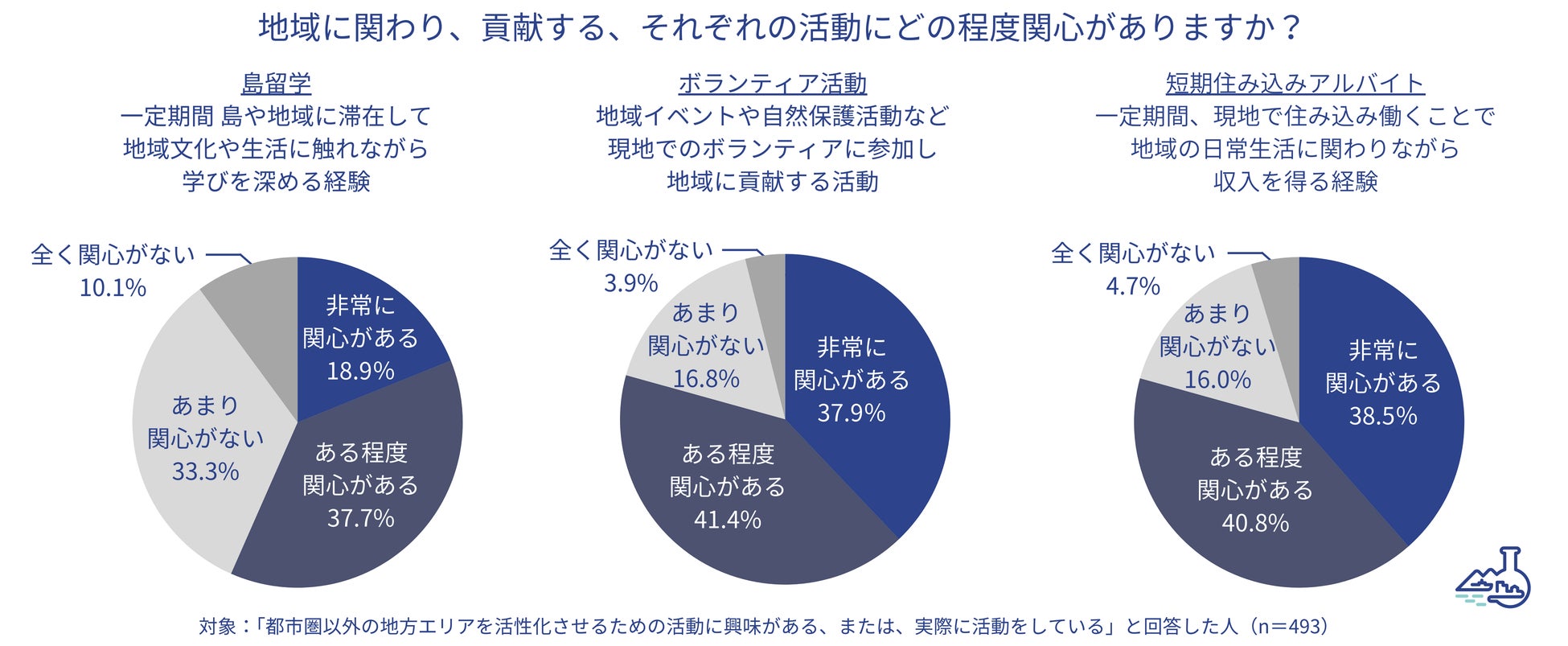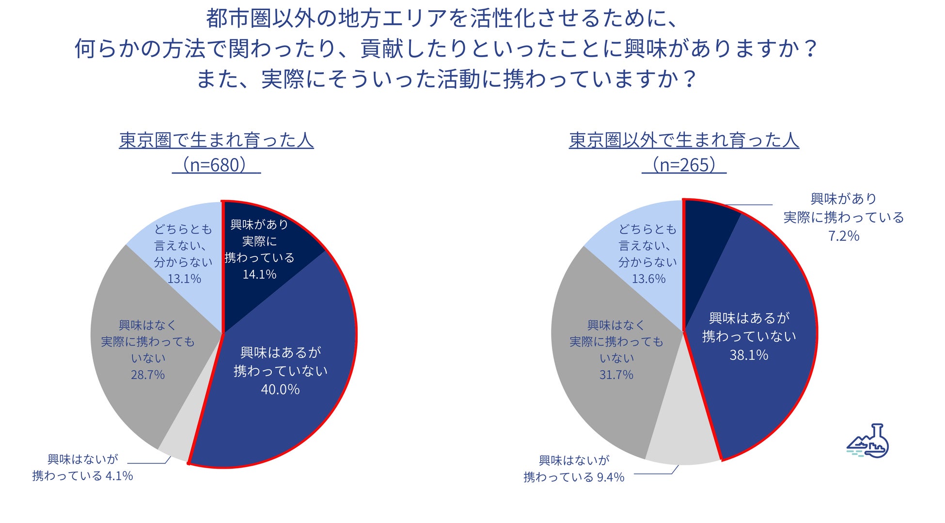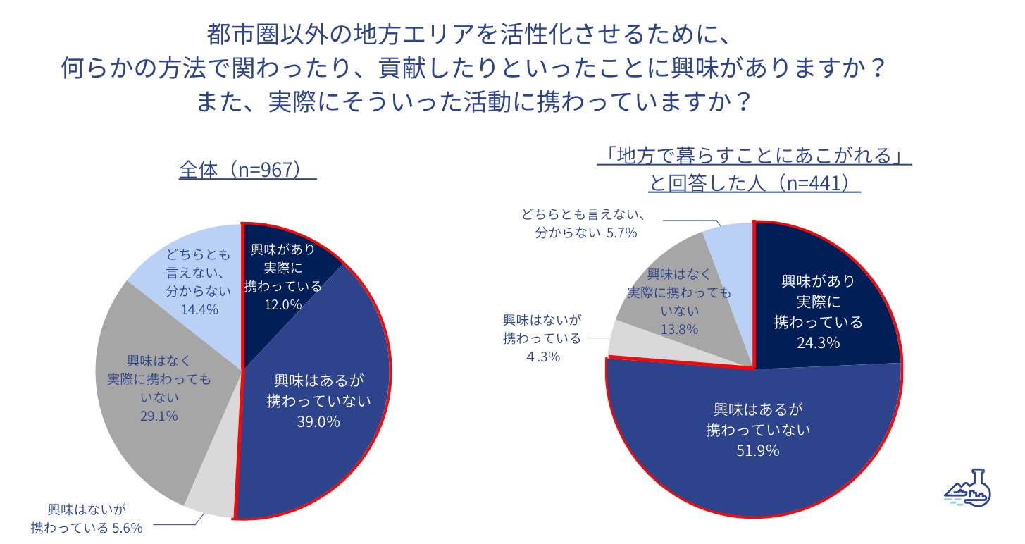 地方を活性化させるための活動への興味を尋ねると全体では51.0%、地方で暮らすことに憧れる若者に絞ると、76.2%が、興味がある(「興味があり、実際に携わっている」「興味はあるが、携わっていない」)と回答。地方に憧れる人のうち、実際に携わっている人が24.3%いることも判明した。また、東京圏出身の若者では54.1%が「興味がある」(同上)と答えた。