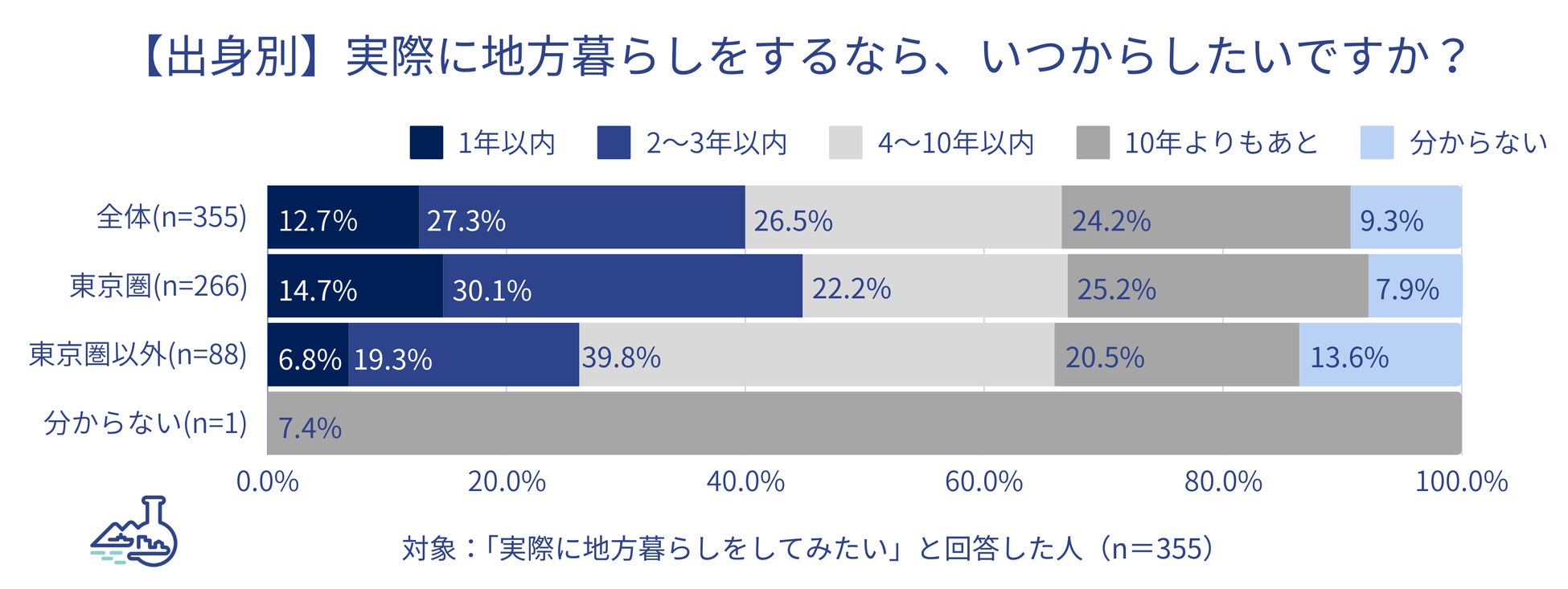 東京圏出身の人は、東京圏以外を出身地とする人に比べて、より早く地方暮らしをしたい人が多い傾向。
