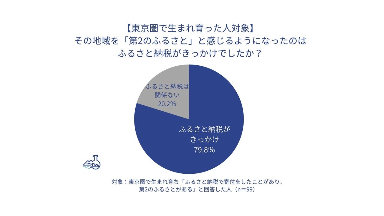 東京圏出身の若者で、ふるさと納税の経験があり、かつ「第2のふるさと」があると答えた人において、約8割が「第2のふるさととの出会いは、ふるさと納税だった」と回答。