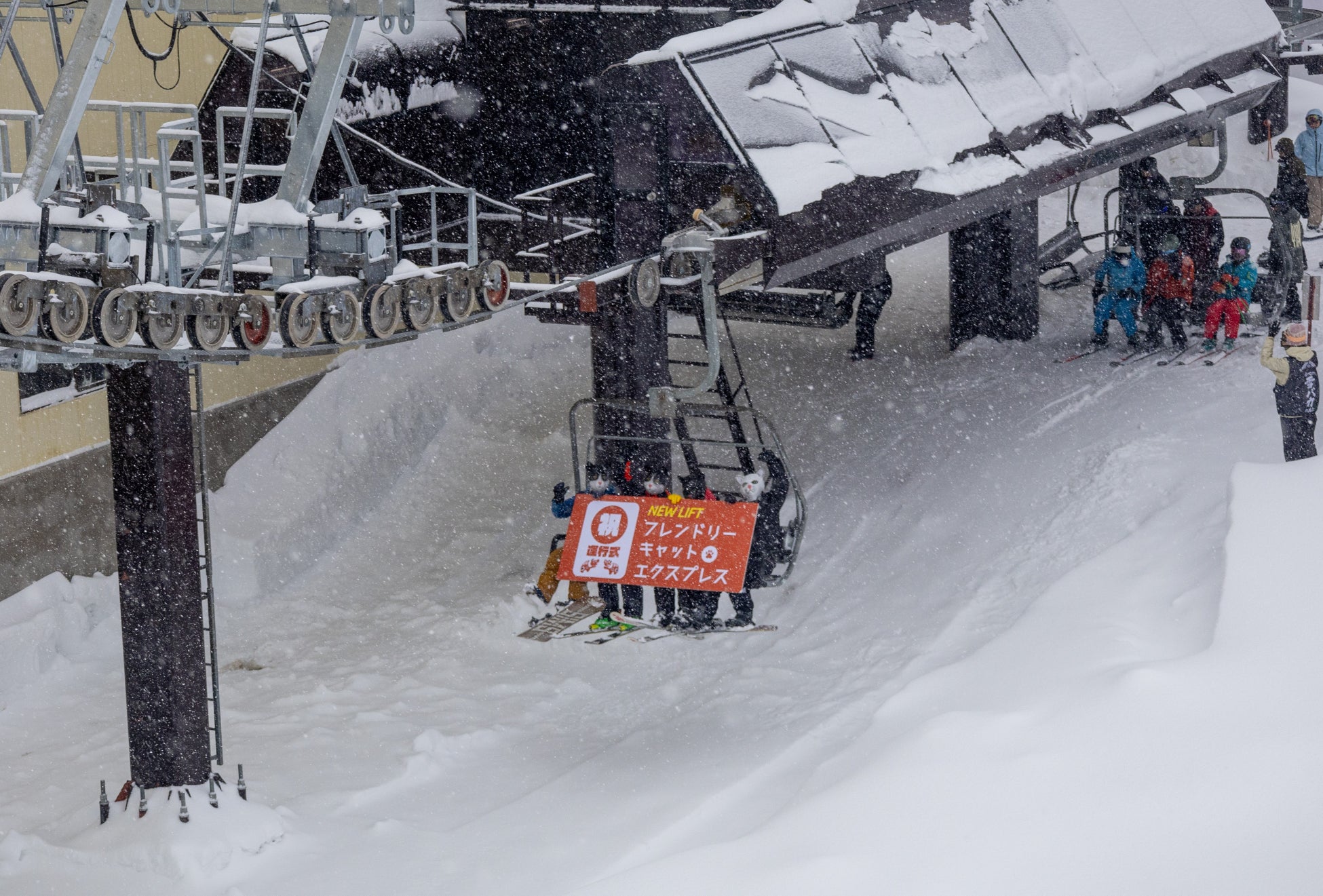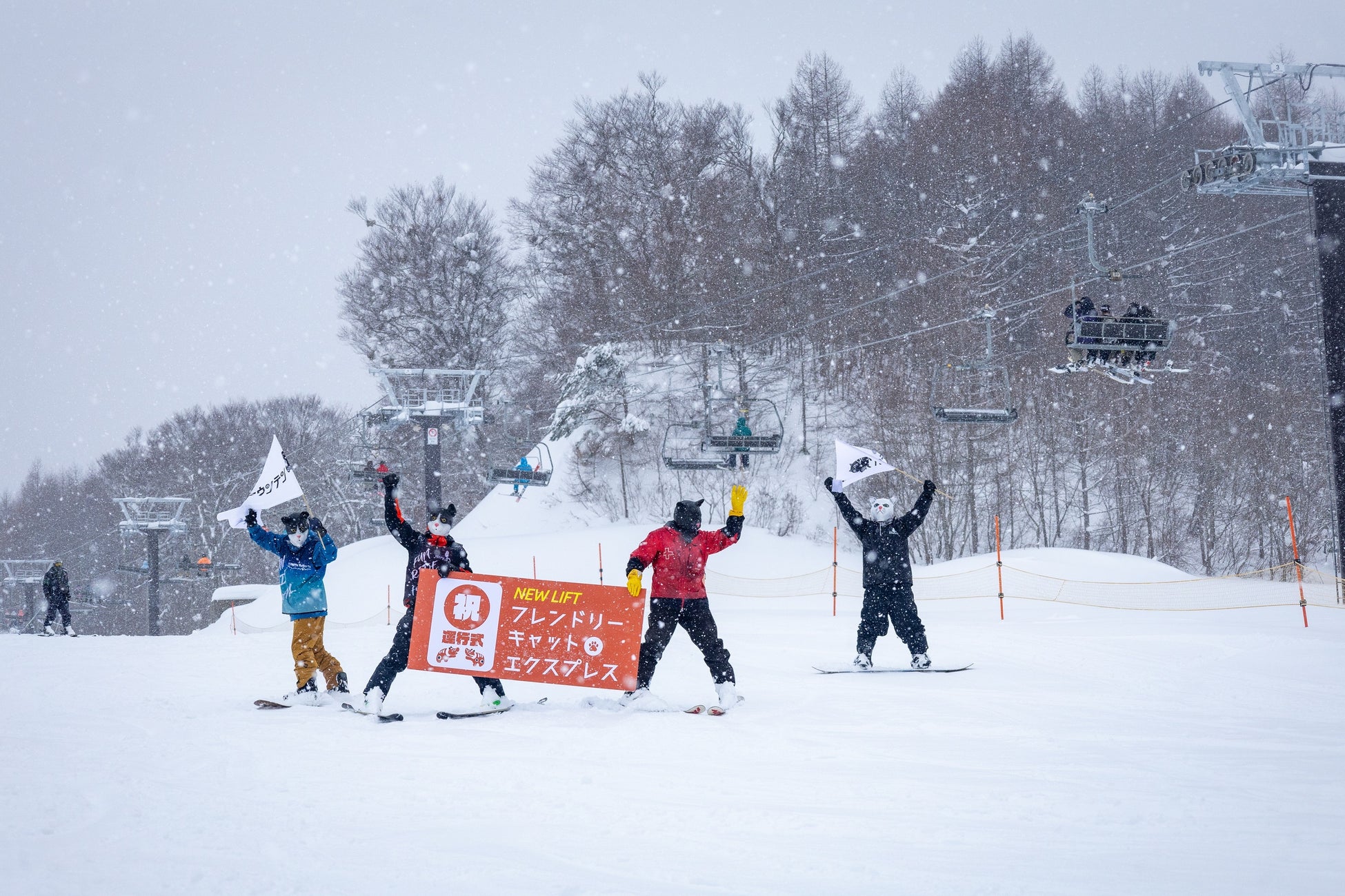 新リフトのオープンを祝い、テープカットを実施、その後、猫に扮したスタッフによるオープニング滑走を行いました。また、初心者コースの充実に伴い、多くの人に新リフトでスキーデビューを飾ってほしいという想いから、オープン初日は小学生以下のレンタルを半額で販売。さらに、新リフト限定のリフト券を無料で販売し、100人以上の方が新リフトに乗車しゲレンデでの滑走を楽しみました。