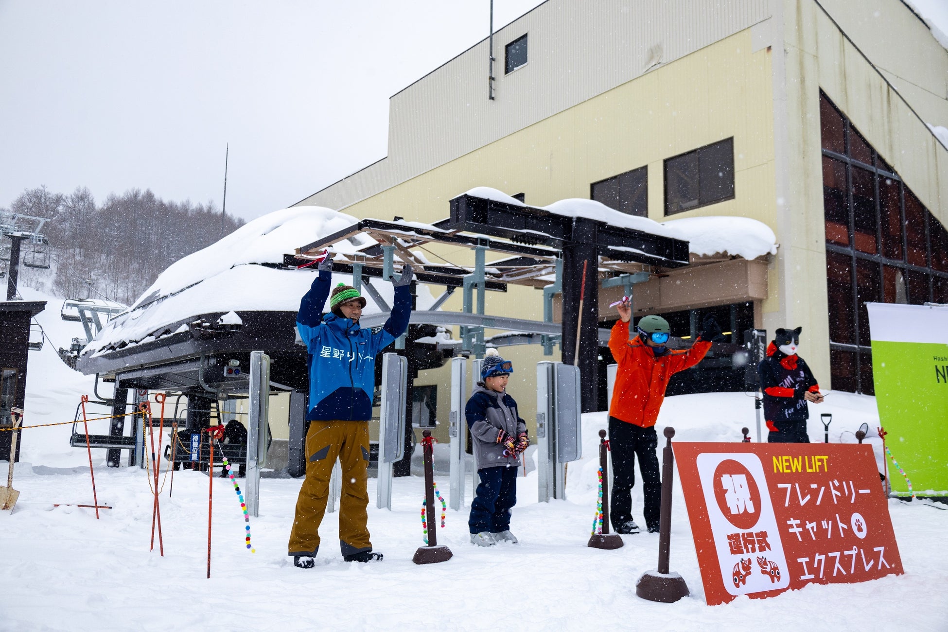 南北に広がる壮大なフィールドをもつスキー場「星野リゾート ネコマ マウンテン(福島県耶麻郡)」は、2024年12月26日に新規に建設されたリフト「フレンドリーキャットエクスプレス」の運行を開始しました。新リフトがかかかることで、ベースの輸送力が大幅に向上し、待ち時間の緩和につながります。さらに、これまで中上級者向けのコースを通らないとアクセスできなかったエリアに、直接移動できるようになり、初級者の方が滑走できるコースが広がります。当日は支配人と共に一番乗りで駆け付けたゲストと共にリフトのテープカットを行い、リフトの運行を祝いました。
