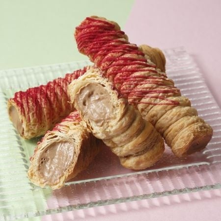 フランボワーズとチョコレートのクリームに旬の苺を入れて、サクサクのコルネに絞り入れました。