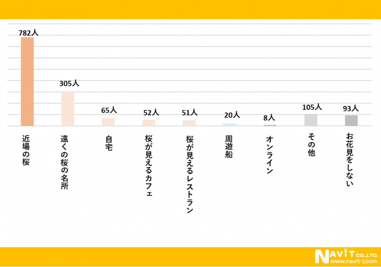 「どこでお花見をしますか?」という質問を複数回答可で行ったところ、「近場の桜」が782人、「遠くの桜の名所」が305人、「自宅」が65人という結果になりました。