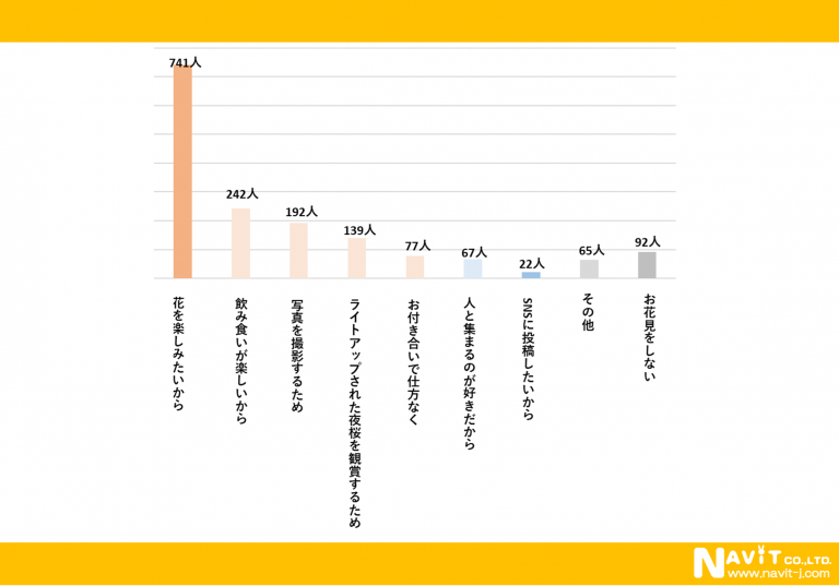 「お花見に行く目的は何ですか?」という質問を複数回答可で行ったところ、「花を楽しみたいから」が741人、「飲み食いが楽しいから」が242人、「写真を撮影するため」が192人という結果になりました。