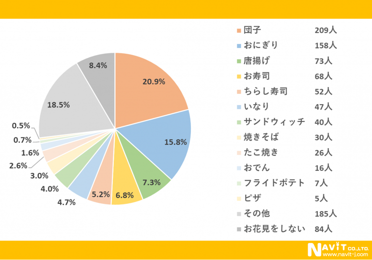 「お花見の際に最も食べたいものは何ですか?」という質問については、「団子」が20.9%、「おにぎり」が15.8%、「唐揚げ」が7.3%という順になりました。