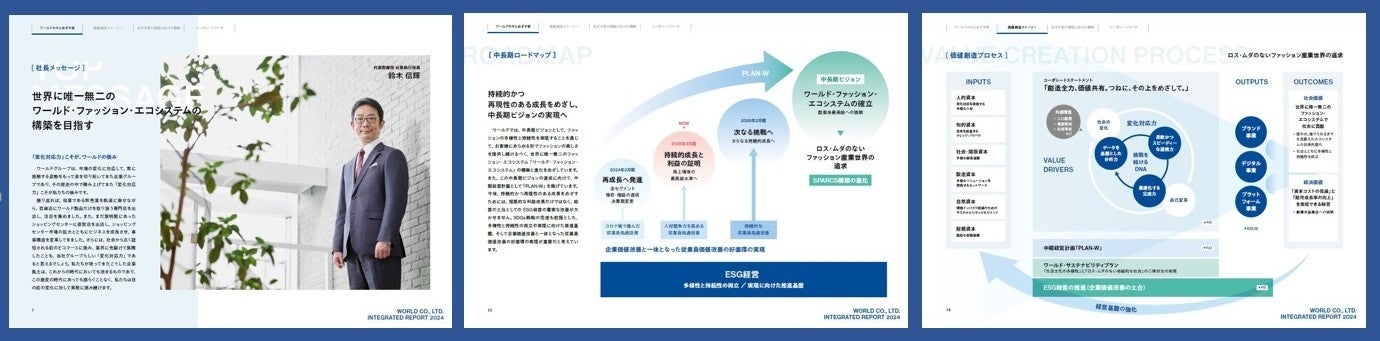 株式会社ワールド(本社:神戸市、代表取締役 社長執行役員:鈴木 信輝)は、本日、初の統合報告書を公開いたしました。この報告書は、当社の財務状況に加え、環境・社会・ガバナンス(ESG)のパフォーマンスを包括的に報告することを目的としております。当社は、企業の持続可能性を重視し、経済的価値の創造のみならず、社会的責任の遂行が極めて重要であると考えております。今後は、成長戦略においてステークホルダーの皆様との信頼関係を一層深め、当社が掲げる “ワールド・ファッション・エコシステム”の進化とともに、持続可能なビジネスモデルの確立に努めてまいります。
