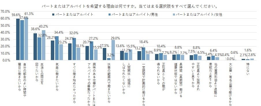 求人に応募した、パートまたはアルバイトを希望する人に、なぜその雇用形態を希望するのかを聞いた(複数回答)。最も多かったのは「自分の都合のよい時間や曜日に働きたいから」で59.6%、次いで「生活との両立を図りたいから」が38.6%、「気楽に働きたいから」が28.2%となった。