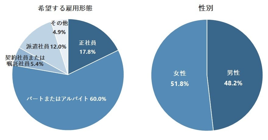一方、「女性」のほうが「男性」よりも「扶養の範囲内で働きたいから」が25.8pt、「生活との両立を図りたいから」が10.4pt高くなった。制限がある中での働き方として、パート・アルバイトを希望している人が多いことがわかる。