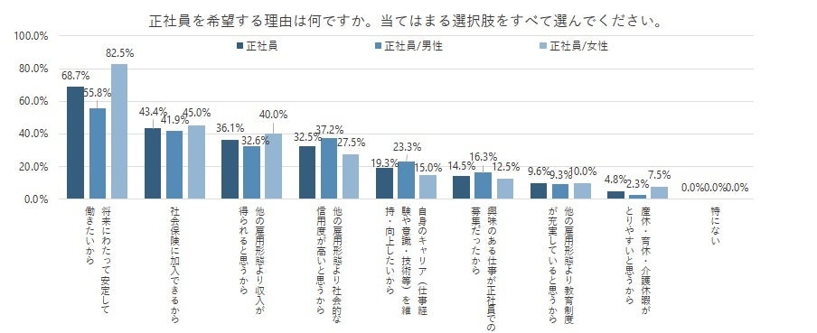 一方、「女性」のほうが「男性」よりも「将来にわたって安定して働きたいから」が26.7pt、「他の雇用形態より収入が得られると思うから」が7.4pt、「産休・育休・介護休暇が取りやすいと思うから」が5.2pt高くなった。継続した雇用のほか、収入面や福利厚生にもこだわっている傾向がみられる。