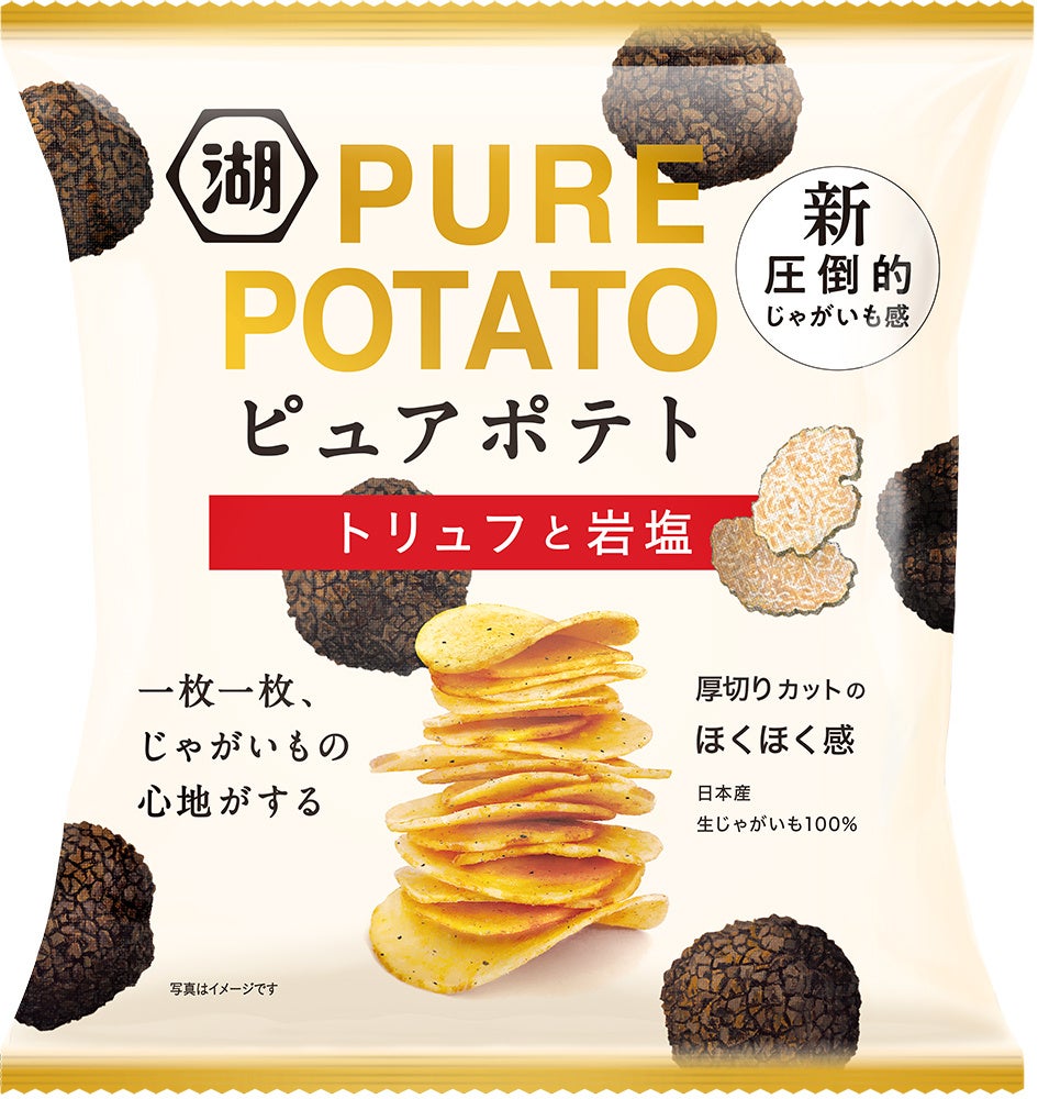 素材にこだわり、国産生じゃがいもを贅沢な厚さにスライスして揚げた「ピュアポテト」ブランドは、じゃがいもの濃い味わいと特有のホクホク感で、“じゃがいもを味わう”厚切りポテトチップスとしてお客様にご好評をいただいています。じゃがいも本来の濃い味わいと、それに負けないしっかりとした味付けの相乗効果によって、1 枚 1 枚食べごたえのある味わいが楽しめ、日常の中での“ご褒美ポテトチップス”として高い人気を誇っています。