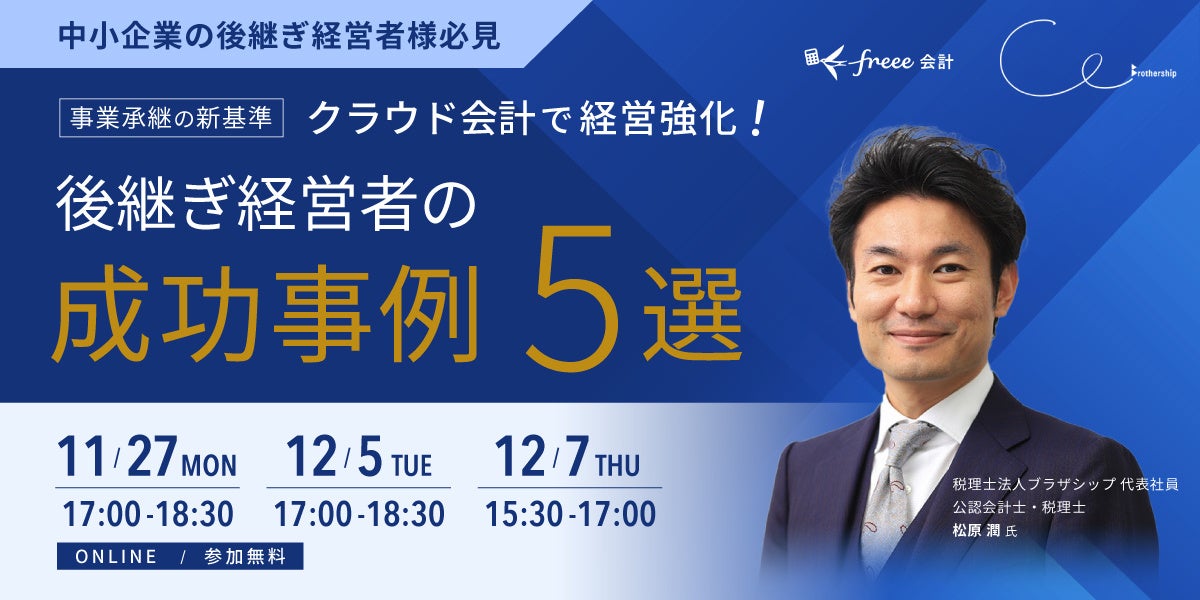 ・freee株式会社は「クラウド会計で経営強化! 後継ぎ経営者の成功事例5選」セミナーを11月27日(月)、12月5日(火)、12月7日(木)にオンラインで開催します