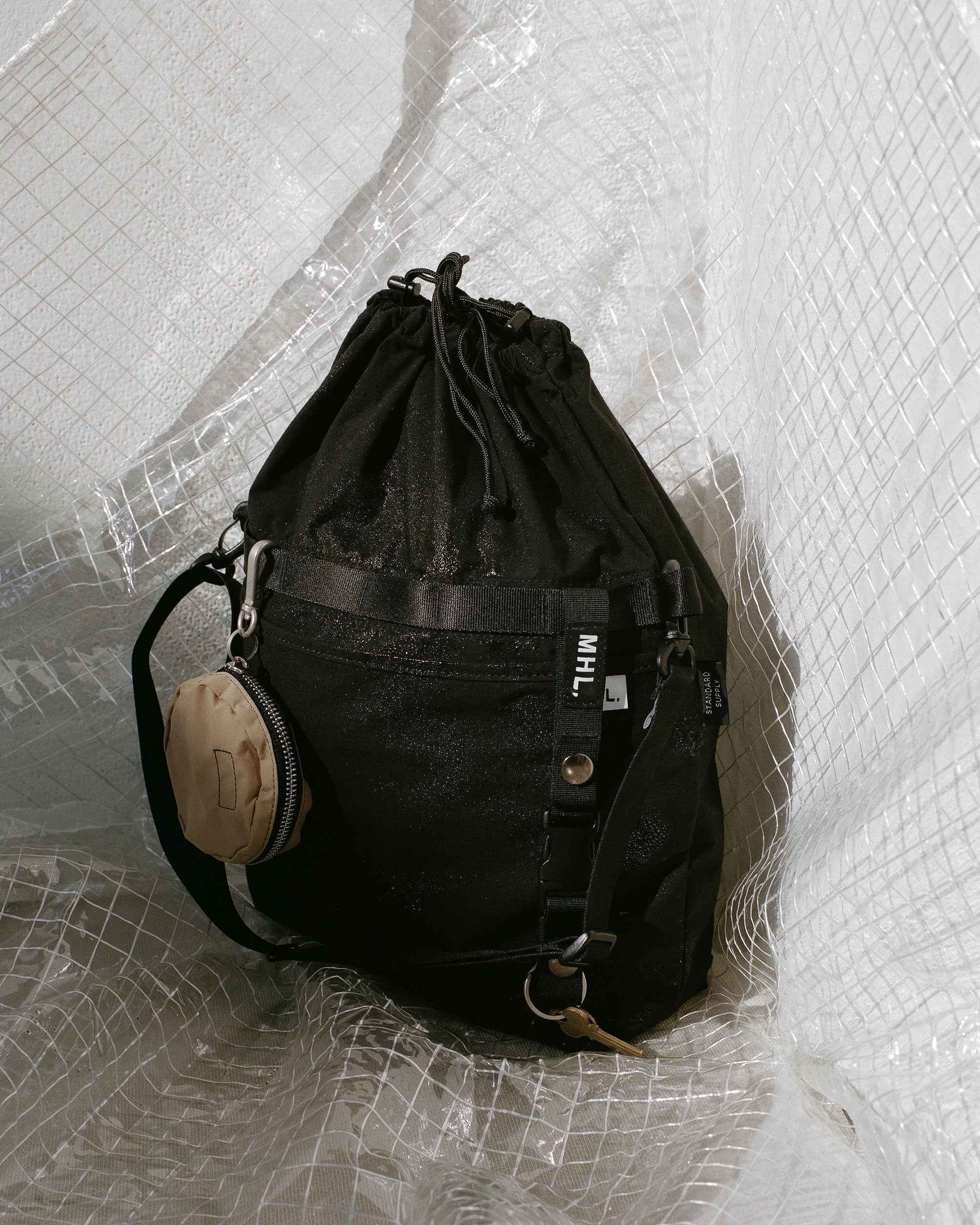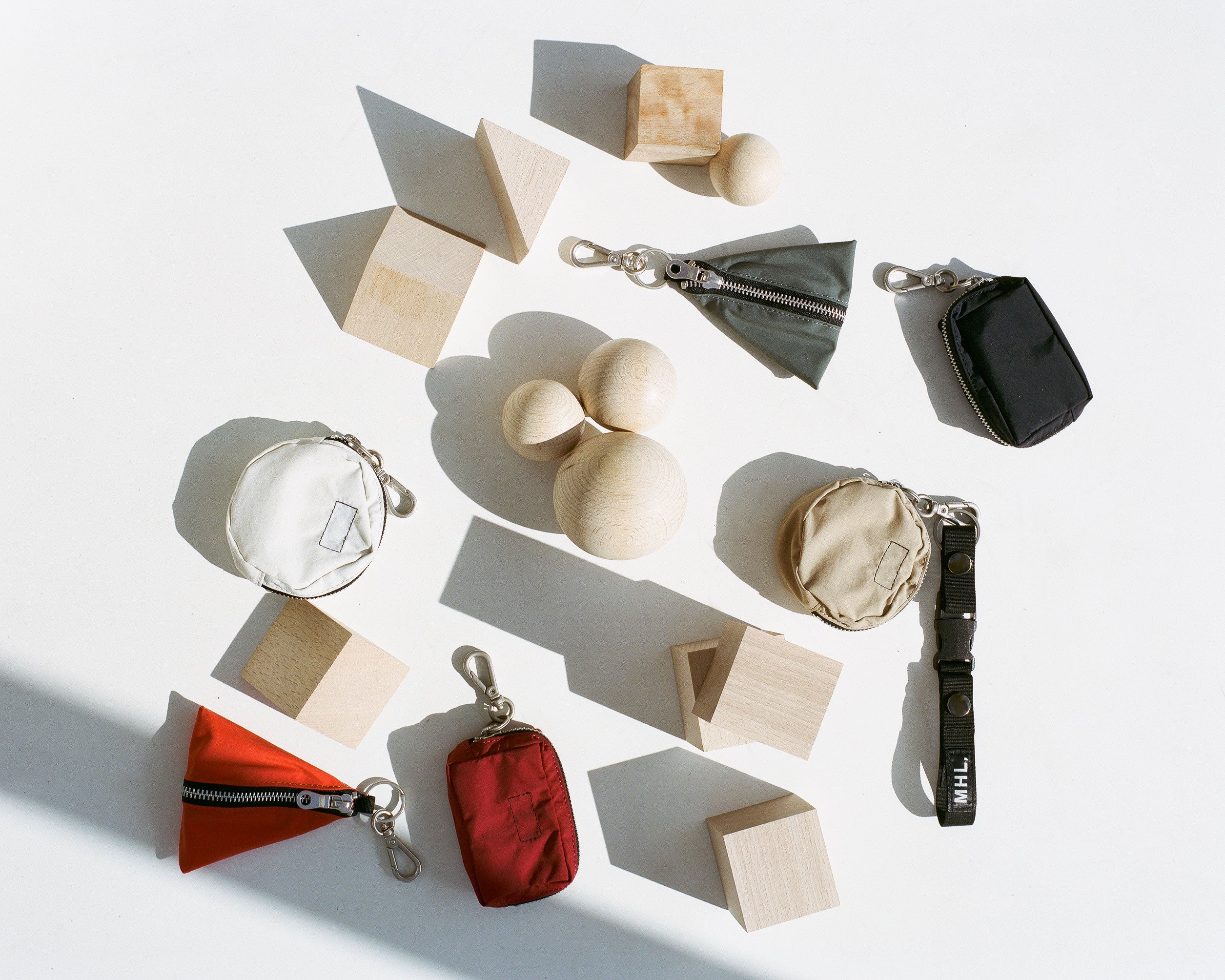 コットンナイロン素材のデイパックは、PC ポケットと撥水加工を備えた実用的な設計。収納力が高い巾着仕様のショルダーは、撥水加工と着脱可能ストラップを備えた機能的デザインがポイントで、〇△□のアイコニックなチャームポーチやリュックとショルダーに使用しているベルトを用いたキーホルダーが登場します。