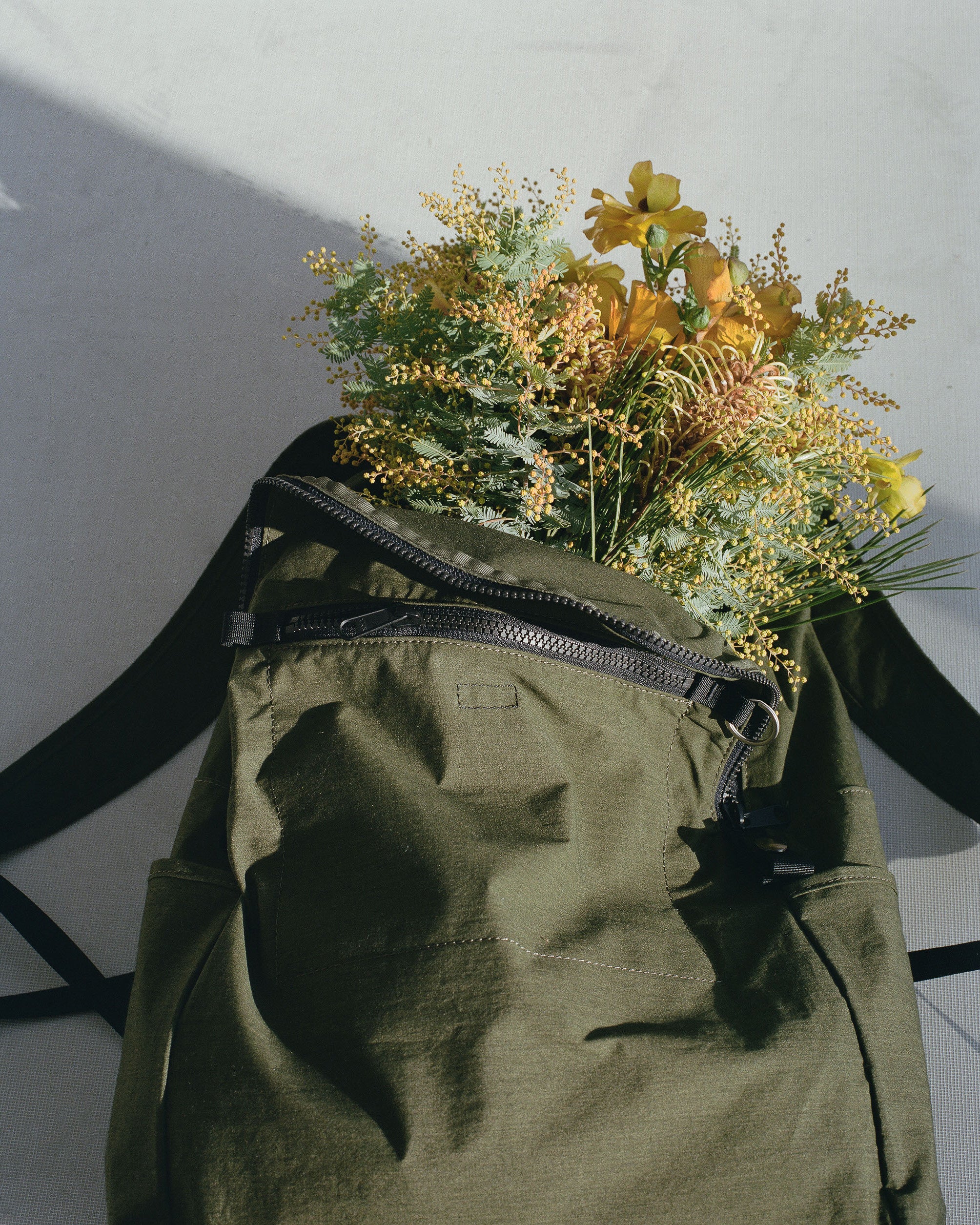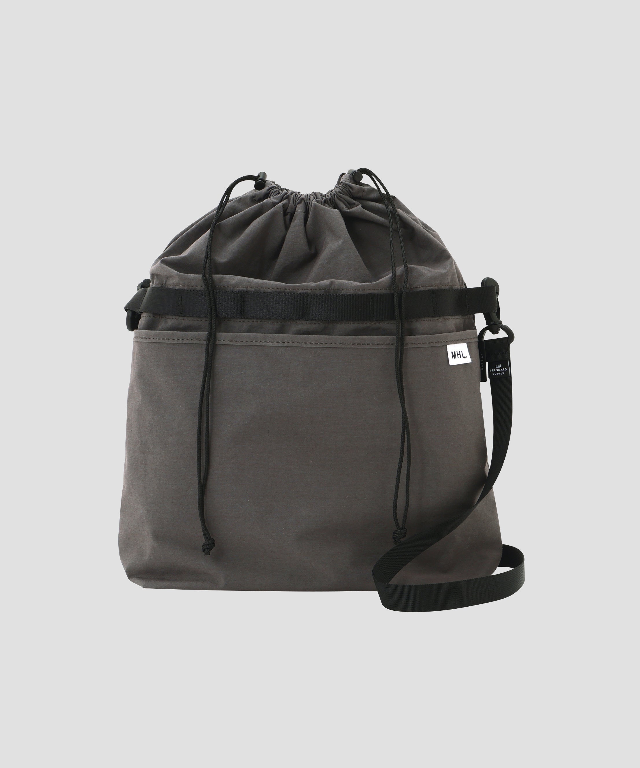 開口部をコードで絞るデザインで、撥水加工が施された、見た目以上の収納力が魅力のショルダーバッグ。開口部は高さを変えられ、使わない時は小さく畳んでバッグ内部に収納することも可能です。前ポケット上部に配したループ式テープは、ギアの取り付けを想定した機能性と拡張性を高めたタフな印象に仕上げています。
