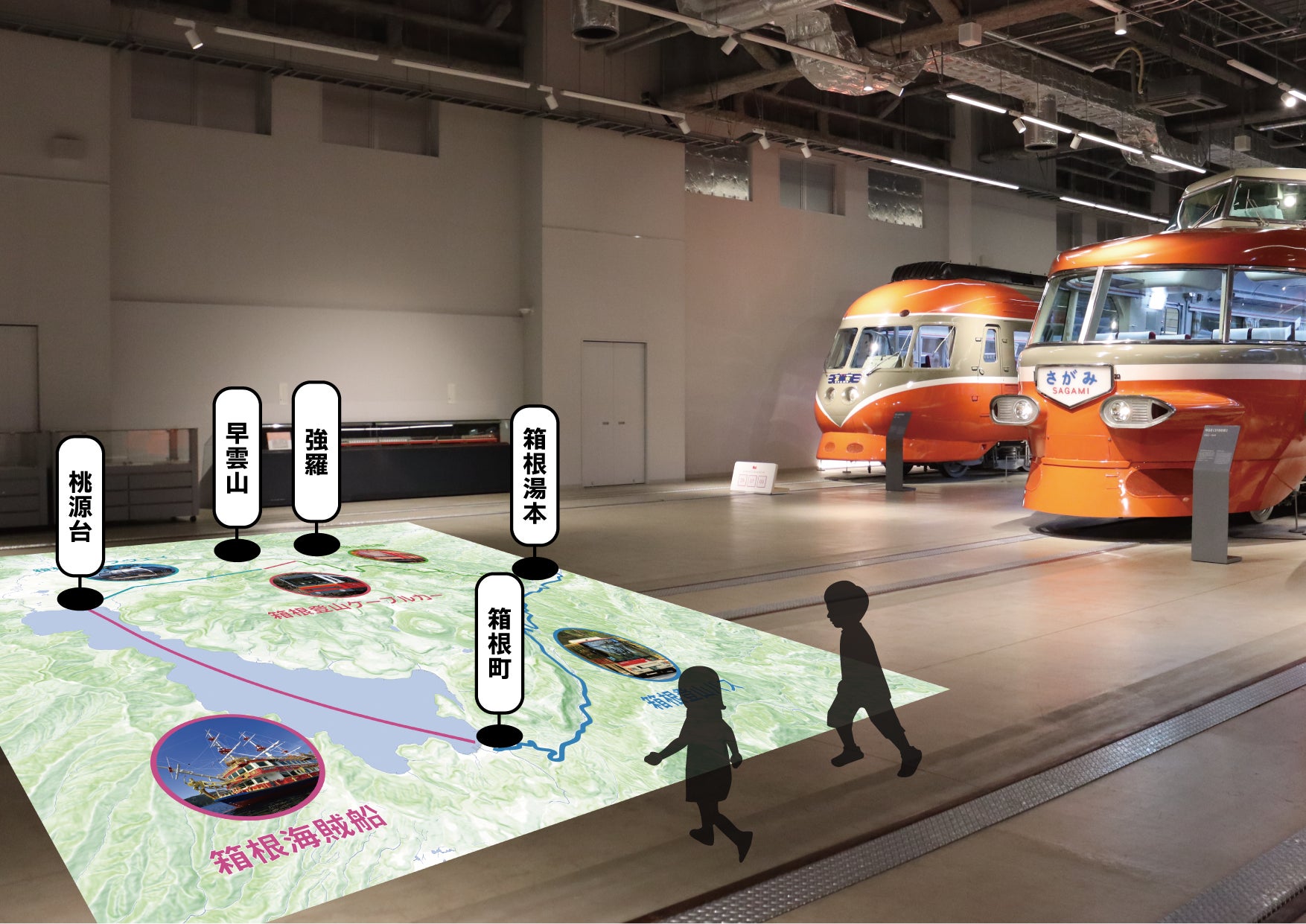 本企画期間を通じて実施する展示「箱根をつなぐ旅のかたち -ゴールデンコースのひみつ-」では、同コースを約1/1900スケールで再現したマップ(45.5㎡)をロマンスカーギャラリーの床面に広げます。各乗り物についての説明パネルをご用意して、マップ上でスタンプラリーを行うことで、箱根に行ったことのない小さなお子さまには、ロープウェイや海賊船などを乗り継ぐ箱根ゴールデンコースの疑似周遊体験をお楽しみいただけます。このほか、同コースを構成する登山電車のヘッドマークや海賊船の船名板、コースが開通した当時のパンフレットなどの史料展示も行います。