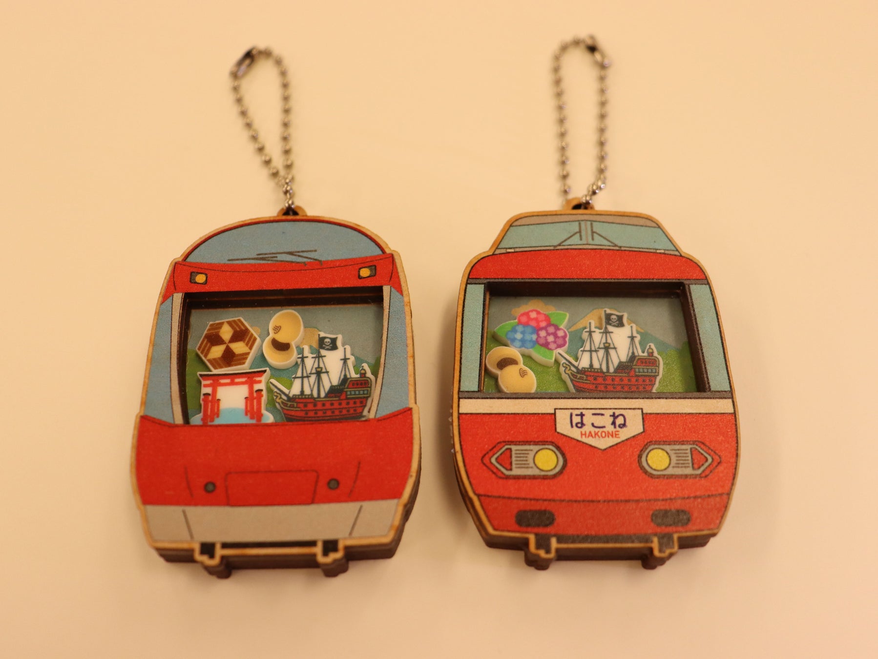 「ロマンスカーキーホルダー作り」では、GSE(70000形)やNSE(3100形)などをモチーフにしたフレームパーツを選んでいただき、アジサイなど箱根を代表するコンテンツをデザインしたフレークと組み合わせて、オリジナルキーホルダーを制作いただけます。