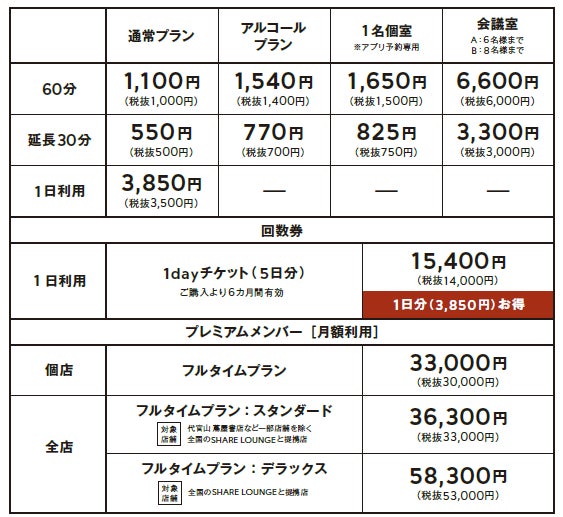 ■SHARE LOUNGE 外苑前 料金表